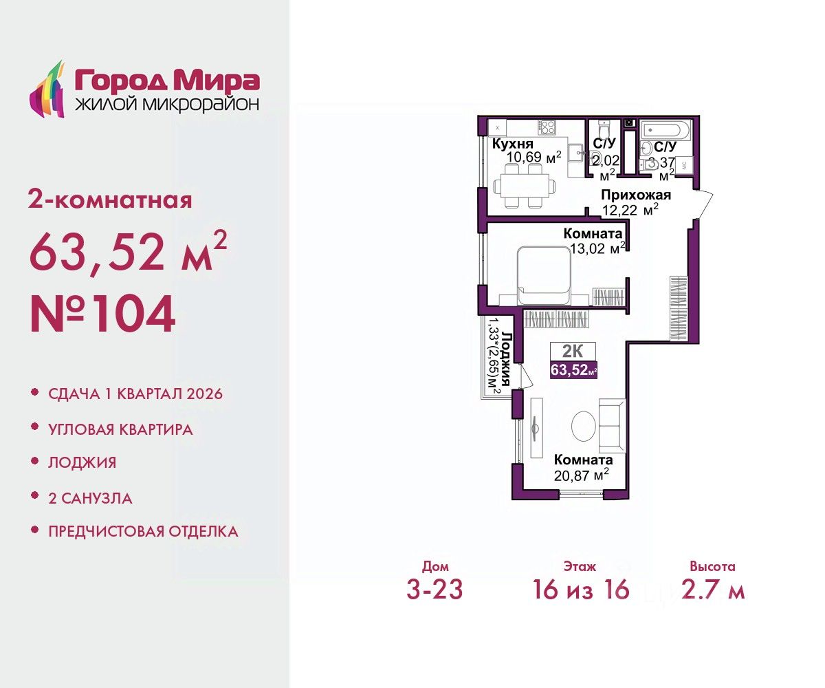 Продается 2-комн. квартира с предчистовой отделкой в ЖМ ''Город Мира'' на 16 этаже. Общая площадь: 63.52 кв.м., жилая: 33.89 кв.м., площадь просторной кухни-столовой: 10.69 кв.м. Квартира угловая, идеально подойдет любителям тишины и панорамных видов. В квартире одна лоджия, один совмещенный и один раздельный санузел. Высота потолков 2.7 м. Жилой комплекс ''Город Мира'' комфорт и гармония в современном формате. ''Город Мира'' это масштабный жилой комплекс, созданный для тех, кто ценит комфорт, безопасность и гармонию с природой. Здесь продумана каждая деталь от удобной инфраструктуры до эргономичных планировок квартир. В 2024 году микрорайон ''Город Мира'' победил в номинации ''Лучший экологический проект года в сфере строительства'' по версии премии Crimea Urban Awards. Ключевые преимущества комплекса: - удачное расположение зеленый район с благоприятным микроклиматом - продуманное зонирование жилые кварталы, зоны отдыха и коммерческие объекты - комфорт-класс высокое качество строительства и современные инженерные решения Инфраструктура ''Города Мира'': Образование и досуг: - 2 детских сада (по 260 мест каждый) - планируется строительство общеобразовательной школы - детские и спортивные площадки в каждом дворе - беседки для отдыха, зоны для выгула собак Ритейл и сервис: - магазины, аптеки, медицинские центры - фитнес-клубы, салоны красоты - детские развивающие центры Парковки: - гостевые парковки - наземные и подземные паркинги Квартиры с продуманным комфортом: - просторные планировки с кладовыми и колясочными - лоджии с остеклением - автономное отопление (по 23 дому: индивидуальное отопление) - выполнена стяжка пола (по 3, 4, 20, 21, 22 домам: выполненная стяжка пола и штукатурка стен) - Консьерж-сервис для дополнительного удобства Благоустройство территории: - ландшафтный дизайн с зонами отдыха - современные детские площадки - стильные холлы с дизайнерской отделкой - система видеонаблюдения для безопасности ''Город Мира'' это место, где созданы все условия для комфортной жизни. Выбирайте качество и продуманность в каждой детали! Квартира находится в корпусе 3_23. Дом монолитный, одноподъездный, высотой 16 этажей. В подъезде 1 пассажирский и 1 грузовой лифт. Окончание строительства - 1 квартал 2026 года. Оформление сделки по договору долевого участия. #ZM6uI2