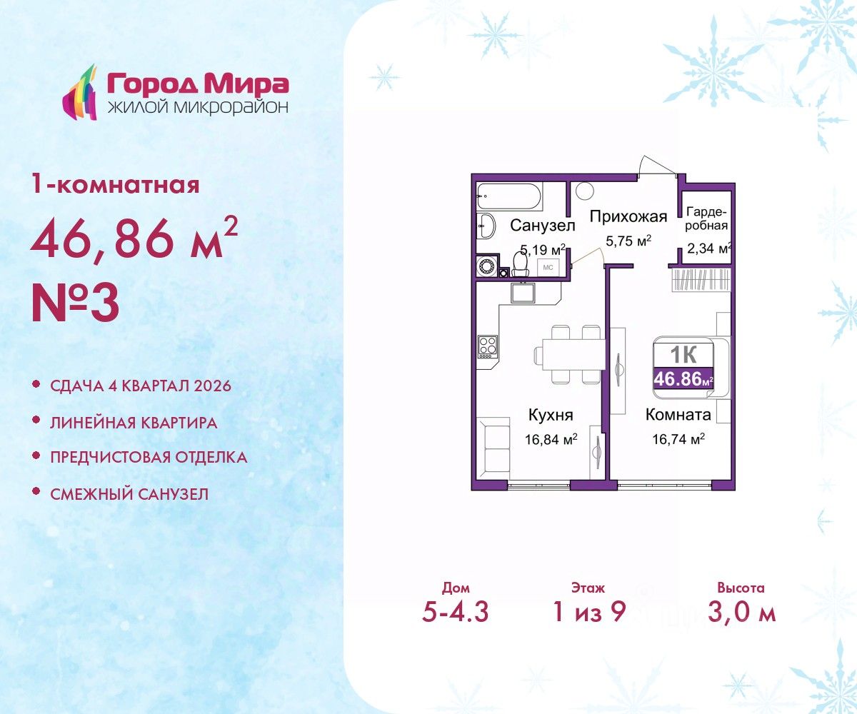 Продается 1-комн. квартира с предчистовой отделкой в ЖМ ''Город Мира'' на 1 этаже. Общая площадь: 46.86 кв.м., жилая: 16.74 кв.м., площадь просторной кухни-столовой: 16.84 кв.м. Все окна выходят на одну сторону. В квартире один совмещенный санузел. Высота потолков 3,0 м. Квартиры в ЖК ''Город Мира'' ваш комфорт начинается здесь! ''Город Мира'' это масштабный жилой комплекс, созданный для тех, кто ценит комфорт, безопасность и гармонию с природой. Здесь продумана каждая деталь: от удобной инфраструктуры до эргономичных планировок квартир. В 2024 году микрорайон ''Город Мира'' победил в номинации ''Лучший экологический проект года в сфере строительства'' по версии премии Crimea Urban Awards. Почему выбирают наш комплекс: - Зеленый оазис живите среди природы в черте города. - Всё под рукой 2 детских сада, магазины, фитнес, медицина. - Безопасность: закрытая территория с видеонаблюдением. Наши квартиры: - Просторные планировки с кладовыми. - Автономное отопление: платите только за реальное потребление. - Готовая предчистовая отделка: стяжка пола, штукатурка стен (кроме 3, 4 домов, где нет штукатурки стен). - Консьерж-сервис и подземный паркинг. Инфраструктура комплекса: - Детские и спортивные площадки. - Зоны отдыха с беседками. - Фитнес-клубы и салоны красоты. - Будущая школа на территории, уже функционируют два детских сада. Выгодные условия покупки: - Ипотека от 5,5%, военная ипотека от 5,5%. - Рассрочка. - Материнский капитал на первоначальный взнос. Квартира находится в корпусе 5_4.3. Дом монолитный, одноподъездный, высотой 9 этажей. В подъезде 1 грузовой лифт. Окончание строительства - 4 квартал 2026 года. Оформление сделки по договору долевого участия. #zmgIC6