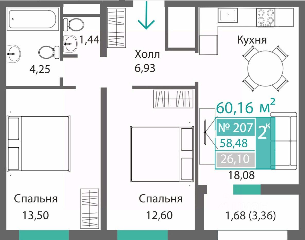 58 м² · Этаж 2 из 9