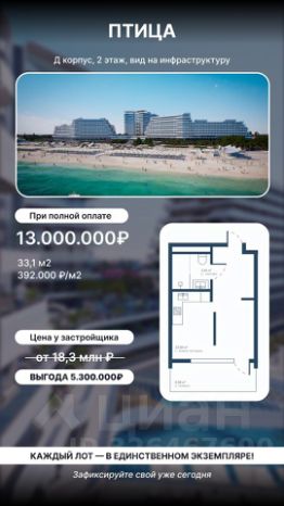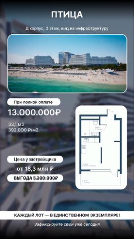 Птица (Саки)Переуступка правоот 13.000.000 ?33.1 м2392.749 ?/м2 Секция ''Д'', 2 этаж Вид во Двор Полная сумма в договореАналоги от застройщика от 18,3 млн ?Выгода 5.300.000 ?НП - 0262Без комиссии для покупателя !ПТИЦА — это отдых в гармонии с природой, но вблизи основных достопримечательностей. Здесь близость к морюи соленому озеру определяет потенциал, а передовые решения формируют высокое качество жизни и отдыха.Берег каламитского залива покрыт мелким песком, кристально чистая вода и пологий спуск к морю обеспечивают максимальный комфорт.Исключительный комплекс, соединяющий в себеоздоровление и отдых уровня 5*Новый взгляд на комфортную среду, в центре которой находится человек, его физическое и ментальное здоровье.Параметры ЖК апарт-комплекс ''ПТИЦА''Срок сдачи 3 кв. 2028Класс жилья элитныйТип дома кирпично-монолитныйЧисло корпусов 1Этажность 16Отделка предчистоваяВысота потолков 2,85 — 3,6 мПаркинг, машиноместа открытый 239Тип договора ДДУ, 214 ФЗОчереди 1Число апартаментов 1 242 Безбарьерная среда естьКолясочные естьБассейн естьДетская площадка естьСпортивная площадка естьПарк на территории естьSPA центр естьТеррасы естьМедицинский центр естьПтица — новая доминанталечебного курорта премиум-класса. Создаем новую территорию для отдыха и оздоровления с разнообразным пространством для прогулок, возможностью насладиться архитектурой и провести время с семьей.Мы продумали разные сценарии жизни: от эргономичных студий 25 м² до роскошных пентхаусов 360 м².Современный променад, который будет обеспечивать регулярный пешеходный трафик гостей. Полная обеспеченность всемиформатами коммерции: супермаркеты, рестораны, ритейл, услуги, фитнес.Собственный санаторий на территории Включает в себя популярные программыоздоровления с применением местных лечебных факторов,таких как широко известные сакские грязи.СПА-ЦЕНТРи круглогодичный бассейн с соленой водой.Покупайте с нами !