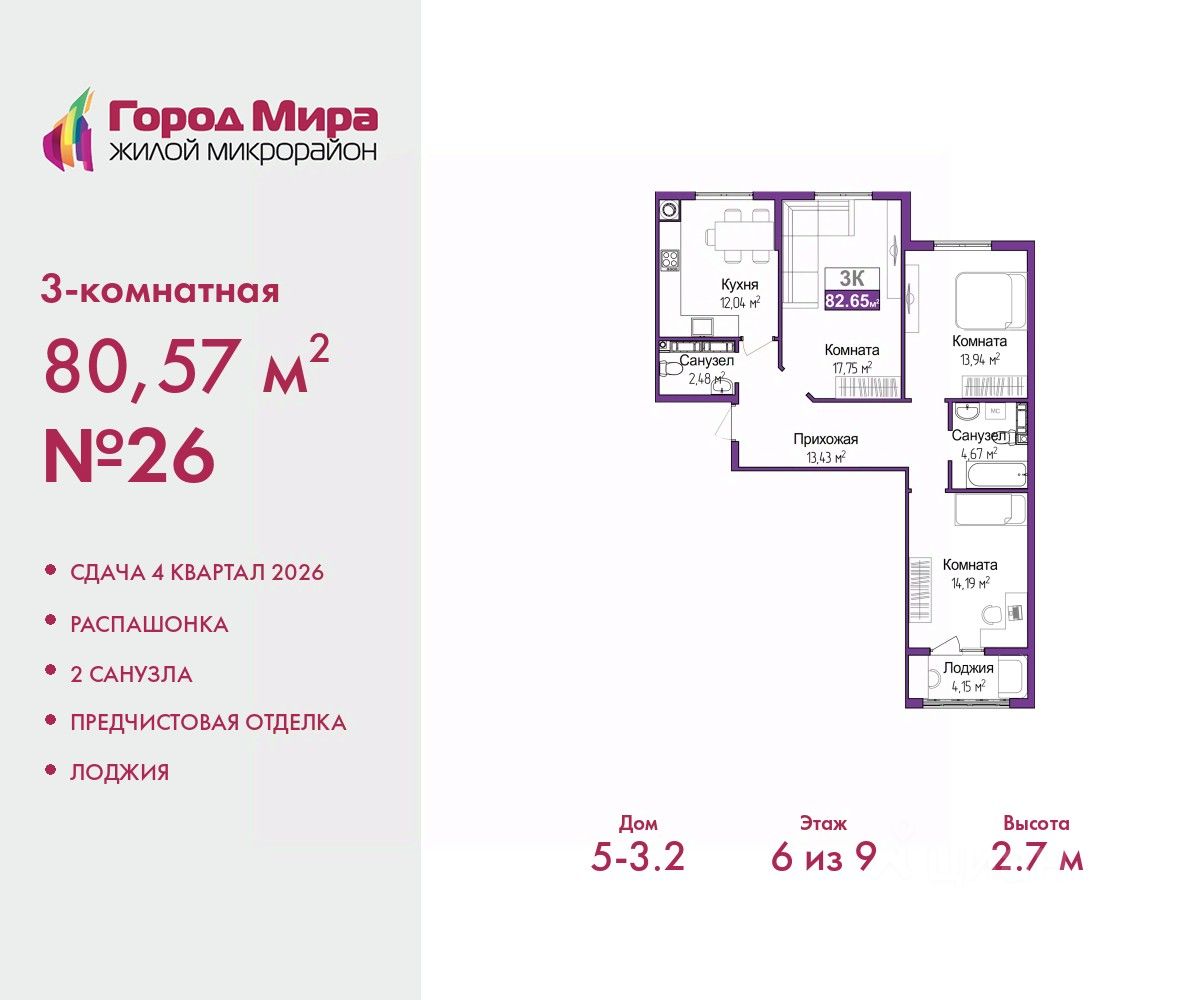 3-комн. квартира с предчистовой отделкой в ЖМ ''Город Мира'' на 6 этаже. Общая площадь: 80.57 кв.м., жилая: 45.88 кв.м., площадь просторной кухни-столовой: 12.04 кв.м. Квартира - распашонка, без проходных комнат, окна выходят на paзные стороны дома. В квартире одна лоджия, один совмещенный и один раздельный санузел. Высота потолков 2.7 м. Квартиры в ЖК ''Город Мира'' ваш комфорт начинается здесь! ''Город Мира'' это масштабный жилой комплекс, созданный для тех, кто ценит комфорт, безопасность и гармонию с природой. Здесь продумана каждая деталь: от удобной инфраструктуры до эргономичных планировок квартир. В 2024 году микрорайон ''Город Мира'' победил в номинации ''Лучший экологический проект года в сфере строительства'' по версии премии Crimea Urban Awards. Почему выбирают наш комплекс: - Зеленый оазис живите среди природы в черте города. - Всё под рукой 2 детских сада, магазины, фитнес, медицина. - Безопасность: закрытая территория с видеонаблюдением. Наши квартиры: - Просторные планировки с кладовыми. - лоджии с остеклением. - Автономное отопление: платите только за реальное потребление. - Предчистовая отделка, включает стяжку пола, без штукатурки стен. - Консьерж-сервис и подземный паркинг. Инфраструктура комплекса: - Детские и спортивные площадки. - Зоны отдыха с беседками. - Фитнес-клубы и салоны красоты. - Будущая школа на территории, уже функционируют два детских сада. Выгодные условия покупки: - Ипотека от 5,5%, военная ипотека от 5,5%. - Рассрочка. - Материнский капитал на первоначальный взнос. Квартира находится в корпусе 5_3.2. Дом монолитный, одноподъездный, высотой 9 этажей. В подъезде 1 грузовой лифт. Окончание строительства - 4 квартал 2026 года. Оформление сделки по договору долевого участия. #zsSA5b