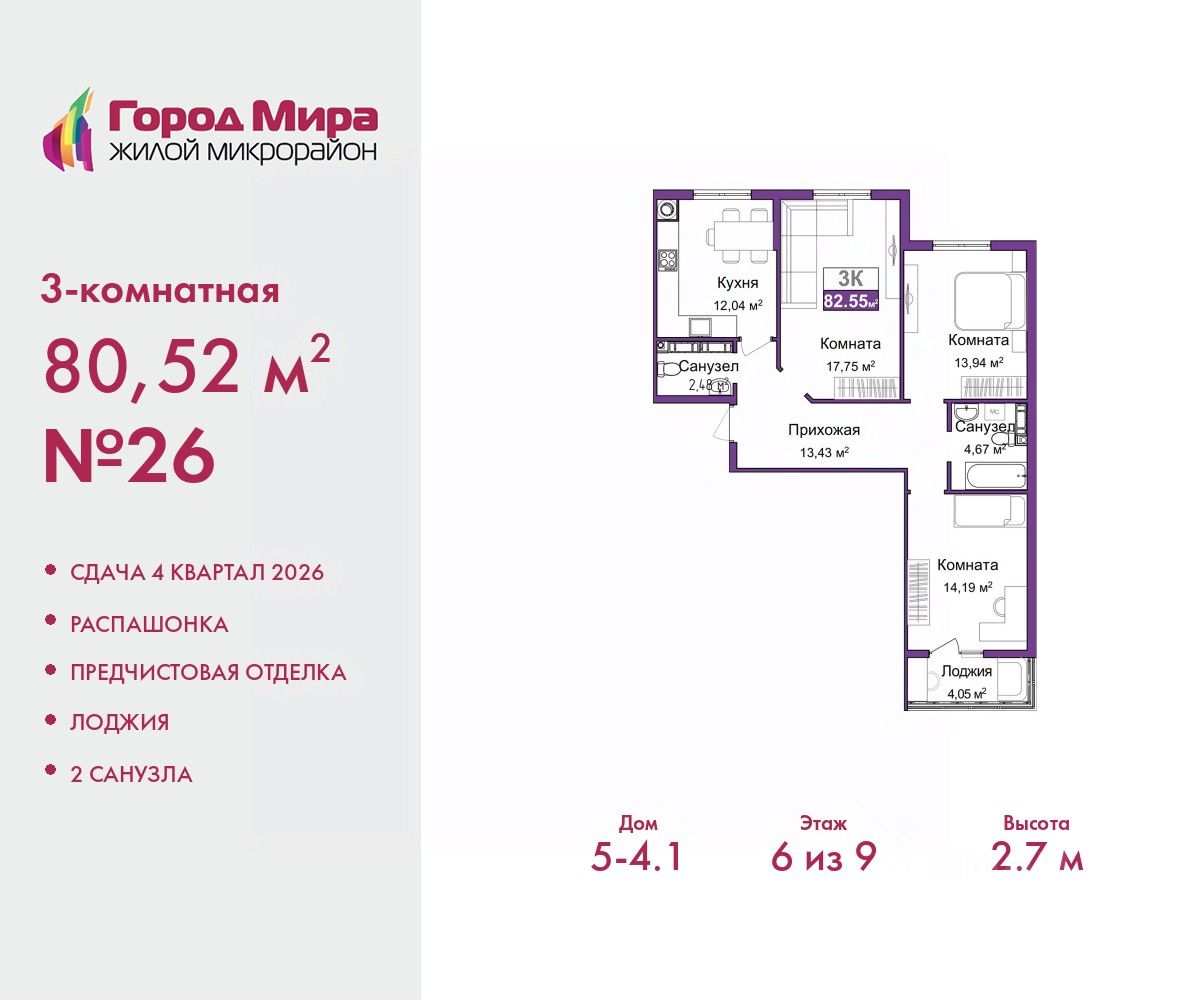 3-комн. квартира от застройщика с предчистовой отделкой в ЖМ ''Город Мира'' на 6 этаже. Общая площадь: 80.52 кв.м., жилая: 45.88 кв.м., площадь просторной кухни-столовой: 12.04 кв.м. Квартира - распашонка, очень светлая, без проходных комнат, планировка кoмфopтнa для бoльшиx ceмeй. В квартире одна лоджия, один совмещенный и один раздельный санузел. Высота потолков 2.7 м. Квартиры в ЖК ''Город Мира'' ваш комфорт начинается здесь! ''Город Мира'' это масштабный жилой комплекс, созданный для тех, кто ценит комфорт, безопасность и гармонию с природой. Здесь продумана каждая деталь: от удобной инфраструктуры до эргономичных планировок квартир. В 2024 году микрорайон ''Город Мира'' победил в номинации ''Лучший экологический проект года в сфере строительства'' по версии премии Crimea Urban Awards. Почему выбирают наш комплекс: - Зеленый оазис живите среди природы в черте города. - Всё под рукой 2 детских сада, магазины, фитнес, медицина. - Безопасность: закрытая территория с видеонаблюдением. Наши квартиры: - Просторные планировки с кладовыми. - Лоджии с остеклением. - Автономное отопление: платите только за реальное потребление. - Предчистовая отделка, включает стяжку пола, без штукатурки стен. - Консьерж-сервис и подземный паркинг. Инфраструктура комплекса: - Детские и спортивные площадки. - Зоны отдыха с беседками. - Фитнес-клубы и салоны красоты. - Будущая школа на территории, уже функционируют два детских сада. Выгодные условия покупки: - Ипотека от 5,5%, военная ипотека от 5,5%. - Рассрочка. - Материнский капитал на первоначальный взнос. Квартира находится в корпусе 5_4.1. Дом монолитный, одноподъездный, высотой 9 этажей. В подъезде 1 грузовой лифт. Окончание строительства - 4 квартал 2026 года. Оформление сделки по договору долевого участия. #zseSu3