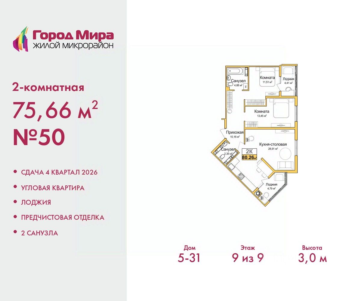 2-комн. квартира с предчистовой отделкой в ЖМ ''Город Мира'' на 9 этаже. Общая площадь: 75.66 кв.м., жилая: 24.96 кв.м., площадь просторной кухни-столовой: 28.91 кв.м. Угловая квартира, идеально подойдет любителям тишины и панорамных видов. В квартире две лоджии, один совмещенный и один раздельный санузел. Высота потолков 3,0 м. Квартиры в ЖК ''Город Мира'' ваш комфорт начинается здесь! ''Город Мира'' это масштабный жилой комплекс, созданный для тех, кто ценит комфорт, безопасность и гармонию с природой. Здесь продумана каждая деталь: от удобной инфраструктуры до эргономичных планировок квартир. В 2024 году микрорайон ''Город Мира'' победил в номинации ''Лучший экологический проект года в сфере строительства'' по версии премии Crimea Urban Awards. Почему выбирают наш комплекс: - Зеленый оазис живите среди природы в черте города. - Всё под рукой 2 детских сада, магазины, фитнес, медицина. - Безопасность: закрытая территория с видеонаблюдением. Наши квартиры: - Просторные планировки с кладовыми. - Лоджии с остеклением. - Автономное отопление: платите только за реальное потребление. - Предчистовая отделка, включает стяжку пола, без штукатурки стен. - Консьерж-сервис и подземный паркинг. Инфраструктура комплекса: - Детские и спортивные площадки. - Зоны отдыха с беседками. - Фитнес-клубы и салоны красоты. - Будущая школа на территории, уже функционируют два детских сада. Выгодные условия покупки: - Ипотека от 5,5%, военная ипотека от 5,5%. - Рассрочка. - Материнский капитал на первоначальный взнос. Квартира находится в корпусе 5_31. Дом монолитный, одноподъездный, высотой 9 этажей. В подъезде 1 грузовой лифт. Окончание строительства - 4 квартал 2026 года. Оформление сделки по договору долевого участия. #25sg9I