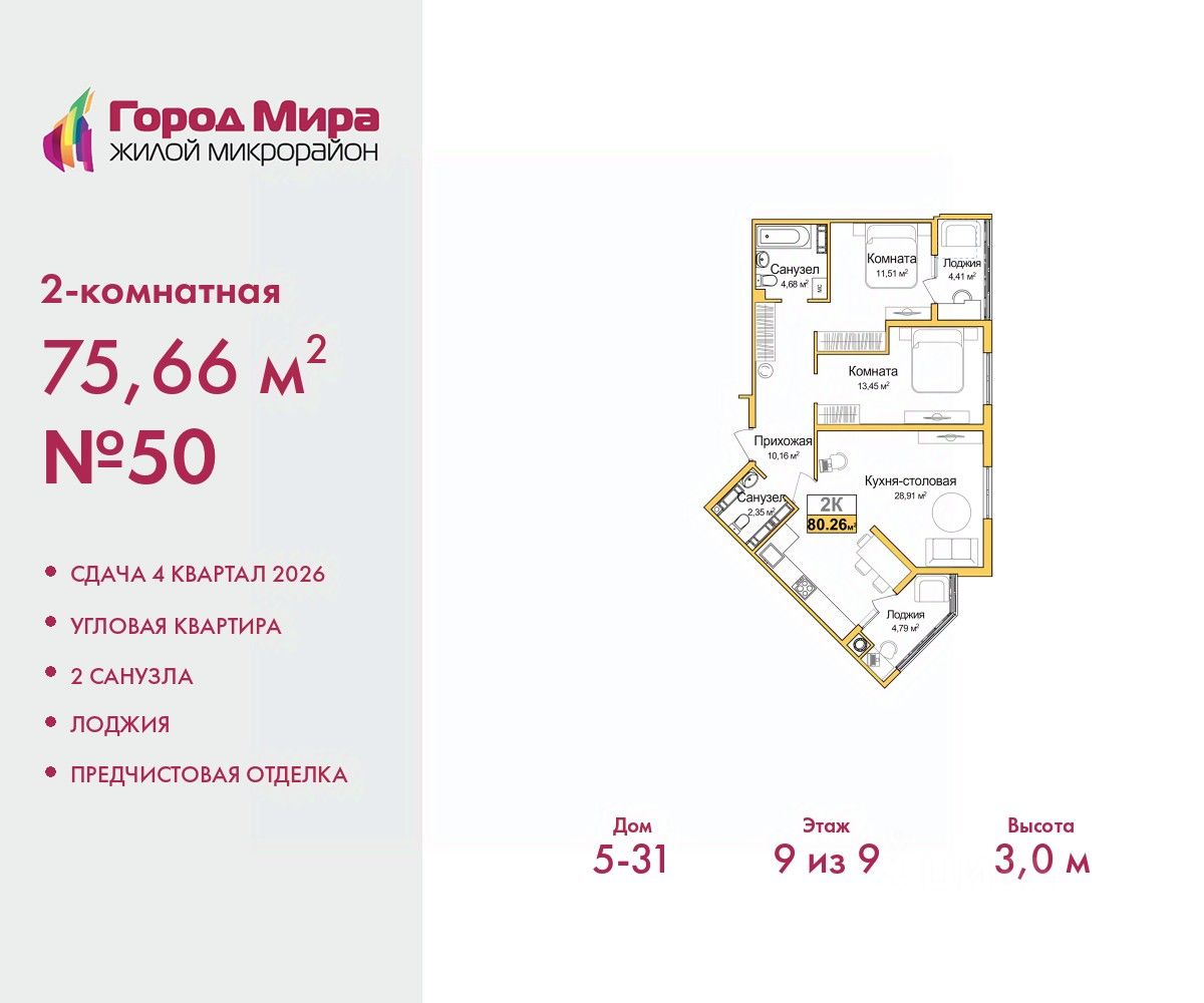 Просторная 2-комн. квартира с предчистовой отделкой в ЖМ ''Город Мира'' на 9 этаже. Общая площадь: 75.66 кв.м., жилая: 24.96 кв.м., площадь просторной кухни-столовой: 28.91 кв.м. Квартира угловая, идеально подойдет любителям тишины и панорамных видов. В квартире две лоджии, один совмещенный и один раздельный санузел. Высота потолков 3,0 м. Квартиры в ЖК ''Город Мира'' ваш комфорт начинается здесь! ''Город Мира'' это масштабный жилой комплекс, созданный для тех, кто ценит комфорт, безопасность и гармонию с природой. Здесь продумана каждая деталь: от удобной инфраструктуры до эргономичных планировок квартир. В 2024 году микрорайон ''Город Мира'' победил в номинации ''Лучший экологический проект года в сфере строительства'' по версии премии Crimea Urban Awards. Почему выбирают наш комплекс: - Зеленый оазис живите среди природы в черте города. - Всё под рукой 2 детских сада, магазины, фитнес, медицина. - Безопасность: закрытая территория с видеонаблюдением. Наши квартиры: - Просторные планировки с кладовыми. - Лоджии с остеклением. - Автономное отопление: платите только за реальное потребление. - Предчистовая отделка, включает стяжку пола, без штукатурки стен. - Консьерж-сервис и подземный паркинг. Инфраструктура комплекса: - Детские и спортивные площадки. - Зоны отдыха с беседками. - Фитнес-клубы и салоны красоты. - Будущая школа на территории, уже функционируют два детских сада. Выгодные условия покупки: - Ипотека от 5,5%, военная ипотека от 5,5%. - Рассрочка. - Материнский капитал на первоначальный взнос. Квартира находится в корпусе 5_31. Дом монолитный, одноподъездный, высотой 9 этажей. В подъезде 1 грузовой лифт. Окончание строительства - 4 квартал 2026 года. Оформление сделки по договору долевого участия. #Zssggi