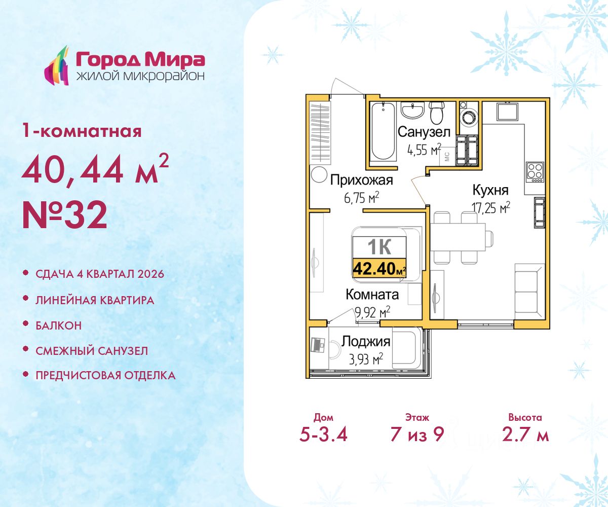 Продается 1-комн. квартира от застройщика с предчистовой отделкой в ЖМ ''Город Мира'' на 7 этаже. Общая площадь: 40.44 кв.м., жилая: 9.92 кв.м., площадь просторной кухни-столовой: 17.25 кв.м. Все окна выходят на одну сторону. В квартире один балкон, один совмещенный санузел. Высота потолков 2.7 м. Квартиры в ЖК ''Город Мира'' ваш комфорт начинается здесь! ''Город Мира'' это масштабный жилой комплекс, созданный для тех, кто ценит комфорт, безопасность и гармонию с природой. Здесь продумана каждая деталь: от удобной инфраструктуры до эргономичных планировок квартир. В 2024 году микрорайон ''Город Мира'' победил в номинации ''Лучший экологический проект года в сфере строительства'' по версии премии Crimea Urban Awards. Почему выбирают наш комплекс: - Зеленый оазис живите среди природы в черте города. - Всё под рукой 2 детских сада, магазины, фитнес, медицина. - Безопасность: закрытая территория с видеонаблюдением. Наши квартиры: - Просторные планировки с кладовыми. - Автономное отопление: платите только за реальное потребление. - Предчистовая отделка, включает стяжку пола, без штукатурки стен. - Консьерж-сервис и подземный паркинг. Инфраструктура комплекса: - Детские и спортивные площадки. - Зоны отдыха с беседками. - Фитнес-клубы и салоны красоты. - Будущая школа на территории, уже функционируют два детских сада. Выгодные условия покупки: - Ипотека от 5,5%, военная ипотека от 5,5%. - Рассрочка. - Материнский капитал на первоначальный взнос. Квартира находится в корпусе 5_3.4. Дом монолитный, одноподъездный, высотой 9 этажей. В подъезде 1 грузовой лифт. Окончание строительства - 4 квартал 2026 года. Оформление сделки по договору долевого участия. #26AiOB