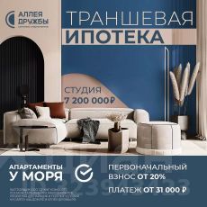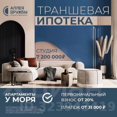 ЗВОНИТЕ ПРЯМО СЕЙЧАС, ЧТОБЫ ПОЛУЧИТЬ ВЫГОДУ ДО 650 000 руб!Цена указана со скидкой 5% при условии 100% оплаты либо ипотека.АКЦИИ:* Ипотека от 14,7%* ТРАНШЕВАЯ ИПОТЕКА - ПВ от 20%, платежи от 31000 в месяц* Рассрочка 0% до 2028г. ПВ от 20%* Скидка 5%* Бронь на 30 дней* 5 мин до моря пешком, планировки от 30 кв.м.* Высота потолков 3 м , предчистовая и чистовая отделка* Ипотека от СБЕРБАНКА* Доходность инвестиций от 30% годовых. * Сдача в аренду от управляющей компании (доверительное управление) позволяет получать доход от сдачи апартаментов без вашего участия* Безопасная сделка по ФЗ-214/эскроу-счёта''Аллея Дружбы'' — это комплекс апартаментов бизнес-класса в Евпатории, расположенный в 5 минутах прогулки от золотистых пляжей Чёрного моря. Два современных 12-этажных корпуса с панорамными видами на море объединены стильным стилобатом с центральным входом и бутиковыми retail-площадями, а закрытая территория и подземный паркинг обеспечивает приватность и безопасность.АРХИТЕКТУРА И КОНСТРУКТИВНЫЕ ОСОБЕННОСТИ:•12-этажное здание в авторском архитектурном стиле•Высота потолков (от 2,9 м до 3,1 м) •Эксклюзивное решение для первых этажей (высота потолков 3,4м)•Евро планировки с террасами и гардеробными•Панорамное ламинированное остекление •Индивидуальные келлеры•Видовые лоты на море•Высокоскоростные лифты по концепции 5* отеля•Предусмотрено резервное электроснабжение•По проекту предусмотрено место для кондиционера и практическое решение для маскировки коммуникацийЛОКАЦИЯ И ОКРУЖЕНИЕ:•До центра Евпатории - 7 минут на машине •Пляж - всего 5 минут пешком •Рядом с комплексом развитая инфраструктура (рестораны, магазины, кафе, медицинские учреждения, санатории) ГОСТЕПРИИМСТВО И БЕЗУПРЕЧНЫЕ СЕРВИСЫ: •Управляющая компания премиум-класса•Консъерж-сервис 24/7•Доставки продуктов и готовой еды•Зона ресепшн оформлена в стилистике комплекса•Лобби с атмосферным кафе и зонами для чтения•Премиальное решение для мест общего пользования•Интерактивная детская комната для самых маленьких •Пункты выдачи товаров от маркетплейсов•Гостевые парковочные места•Организовано место для хранения колясок ваших малышей•Ремонт на выбор ''Комфорт-формат'' и ''Гранд-формат''БЕЗОПАСНОСТЬ И ТЕХНОЛОГИИ СПОКОЙСТВИЯ:•Закрытая территория, двор без машин•Система контроля доступа (строго по электронным пропускам)•Подземный паркинг с тремя типами машиномест •Выделенные места для велосипедов•Камеры видеонаблюдения •Круглосуточный ресепшн •Телеметрия - автоматический сбор и передача данных с приборов учета апартамента минимизирует ошибки и мошенничество•Система умного апартамента с дистанционным управлением БЛАГОУСТРОЙСТВО ТЕРРИТОРИИ: •Ландшафтный дизайн по проекту (2 334 м² озеленения) •Прогулочные аллеи и зоны отдыха для расслабления и медитации•Коворкинг-зоны с высокоскоростным Wi-Fi для бизнес-переговоров•Детские и спортивные площадки •В апарт-комплексе вас ждут мини-маркет и магазин повседневных товаров