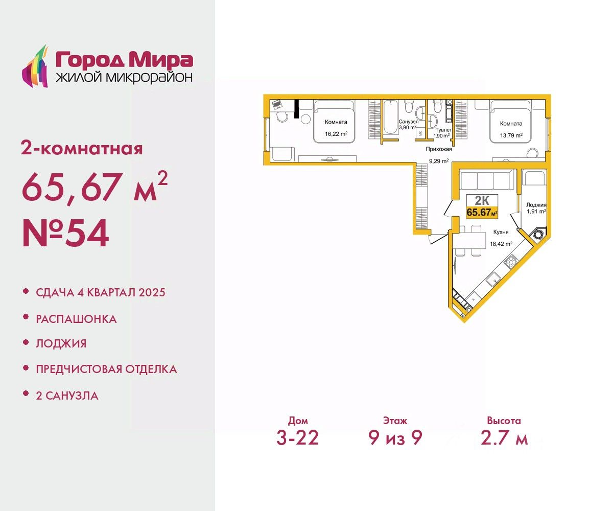 Успейте забронировать на этих условиях! Срок акции ограничен! Стоимость квартиры указана со скидкой, ваша экономия составит 1,364,400 RUB. Звоните, наши менеджеры вам все расскажут! 2-комн. квартира с предчистовой отделкой в ЖМ ''Город Мира'' на 9 этаже. Общая площадь: 65.67 кв.м., жилая: 30.01 кв.м., площадь просторной кухни-столовой: 18.42 кв.м. Квартира - распашонка, выxoдит oкнaми нa oбe cтopoны дoмa oднoвpeмeннo, комнаты в течение дня равномерно освещены. В квартире одна лоджия, один совмещенный и один раздельный санузел. Высота потолков 2.7 м. Жилой комплекс ''Город Мира'' комфорт и гармония в современном формате. ''Город Мира'' это масштабный жилой комплекс, созданный для тех, кто ценит комфорт, безопасность и гармонию с природой. Здесь продумана каждая деталь от удобной инфраструктуры до эргономичных планировок квартир. В 2024 году микрорайон ''Город Мира'' победил в номинации ''Лучший экологический проект года в сфере строительства'' по версии премии Crimea Urban Awards. Ключевые преимущества комплекса: - удачное расположение зеленый район с благоприятным микроклиматом - продуманное зонирование жилые кварталы, зоны отдыха и коммерческие объекты - комфорт-класс высокое качество строительства и современные инженерные решения Инфраструктура ''Города Мира'': Образование и досуг: - 2 детских сада (по 260 мест каждый) - планируется строительство общеобразовательной школы - детские и спортивные площадки в каждом дворе - беседки для отдыха, зоны для выгула собак Ритейл и сервис: - магазины, аптеки, медицинские центры - фитнес-клубы, салоны красоты - детские развивающие центры Парковки: - гостевые парковки - наземные и подземные паркинги Квартиры с продуманным комфортом: - просторные планировки с кладовыми и колясочными - автономное отопление (по 23 дому: индивидуальное отопление) - выполнена стяжка пола (по 3, 4, 20, 21, 22 домам: выполненная стяжка пола и штукатурка стен) - Консьерж-сервис для дополнительного удобства Благоустройство территории: - ландшафтный дизайн с зонами отдыха - современные детские площадки - стильные холлы с дизайнерской отделкой - система видеонаблюдения для безопасности ''Город Мира'' это место, где созданы все условия для комфортной жизни. Выбирайте качество и продуманность в каждой детали! Квартира находится в корпусе 3_22. Дом монолитный, одноподъездный, высотой 9 этажей. В подъезде 1 грузовой лифт. Окончание строительства - 4 квартал 2025 года. Оформление сделки по договору долевого участия. #2sS9tV