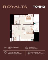 Жилой комплекс ''РОЯЛТА'' включает 5 монолитно-кирпичных девятиэтажных зданий. Проект предлагает квартиры различных планировок: от однокомнатных до трехкомнатных с расширенными балконами и террасами до 13,4 м2. Территория будет благоустроена детскими игровыми и спортивными площадками, гостевой автостоянкой и озеленением, включая газоны, деревья и кустарники. Также появятся современные уличные тренажёры, СПА-комплекс и панорамный инфинити-бассейн. В шаговой доступности находятся центральная набережная Ялты, детские сады, школы, супермаркеты, торговые центры, Ялтинский медицинский колледж, автовокзал и Мордвиновский парк.