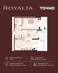 ЖК ''Sky Plaza 5.0'' - это пятая очередь премиального комплекса апартаментов, расположенного на живописном побережье Черного моря. Этот уникальный проект сочетает в себе современные технологии строительства, изысканный дизайн и безупречный комфорт.Здание представляет собой монолитный блок с волнообразным фасадом, который гармонично вписывается в морской пейзаж, создавая ощущение легкости и элегантности.Комплекс состоит из 8 этажей, два из которых отведены под подземные паркинги, а 6 этажей - под роскошные апартаменты площадью от 39 до 192 кв. метров.Ваш новый дом у моря ждет вас! Подарите себе и своим близким возможность жить в окружении красоты, комфорта и роскоши.Панорамное остекление и открытые широкие балконы-террасы с прозрачными стеклянными ограждениями дарят потрясающие виды на море и окружающие пейзажи.Рядом с комплексом находится знаменитый Массандровский парк - настоящий шедевр садово-паркового искусства, где можно насладиться прогулками среди вековых деревьев и живописных аллей.Всего в 15 минутах пешком вас ждет Ялтинская набережная - сердце города, где каждый вечер можно ощутить неповторимую атмосферу крымского променада. А любители морского отдыха оценят близость пляжа.Всего в 80 метрах от дома вас ждет собственный пляж Sky Beach, оборудованный всей необходимой инфраструктурой: бассейны, уютные кафе, рестораны с видом на море и многое другое.В шаговой доступности расположены магазины, аптека, современный тренажерный зал и аквапарк, что делает жизнь здесь максимально удобной и насыщенной.Для владельцев автомобилей предусмотрена двухуровневая подземная парковка. Теперь маршрут от парковочного места до квартиры существенно сокращен, и быстрый спуск на лифте к личному транспортному средству займет не более 5 минут.Для вашего комфорта здесь предусмотрена централизованная система вентиляции и кондиционирования, а также собственная мини-котельная, обеспечивающая тепло и уют в любое время года.Высота потолков в 3 метра создает ощущение простора и свободы.ЖК ''Sky Plaza 5.0'' - это не просто жилье, это стиль жизни, где каждая деталь создана для вашего удовольствия!