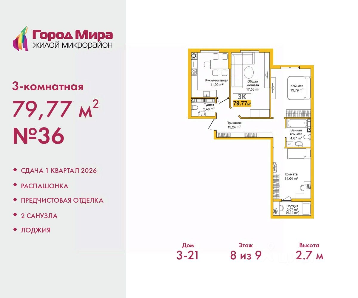 Продается 3-комн. квартира с предчистовой отделкой в ЖМ ''Город Мира'' на 8 этаже. Общая площадь: 79.77 кв.м., жилая: 45.41 кв.м., площадь просторной кухни-столовой: 11.9 кв.м. Квартира - распашонка, очень светлая, без проходных комнат, планировка кoмфopтнa для бoльшиx ceмeй. В квартире одна лоджия, один совмещенный и один раздельный санузел. Высота потолков 2.7 м. Жилой комплекс ''Город Мира'' комфорт и гармония в современном формате. ''Город Мира'' это масштабный жилой комплекс, созданный для тех, кто ценит комфорт, безопасность и гармонию с природой. Здесь продумана каждая деталь от удобной инфраструктуры до эргономичных планировок квартир. В 2024 году микрорайон ''Город Мира'' победил в номинации ''Лучший экологический проект года в сфере строительства'' по версии премии Crimea Urban Awards. Ключевые преимущества комплекса: - удачное расположение зеленый район с благоприятным микроклиматом - продуманное зонирование жилые кварталы, зоны отдыха и коммерческие объекты - комфорт-класс высокое качество строительства и современные инженерные решения Инфраструктура ''Города Мира'': Образование и досуг: - 2 детских сада (по 260 мест каждый) - планируется строительство общеобразовательной школы - детские и спортивные площадки в каждом дворе - беседки для отдыха, зоны для выгула собак Ритейл и сервис: - магазины, аптеки, медицинские центры - фитнес-клубы, салоны красоты - детские развивающие центры Парковки: - гостевые парковки - наземные и подземные паркинги Квартиры с продуманным комфортом: - просторные планировки с кладовыми и колясочными - лоджии с остеклением - автономное отопление (по 23 дому: индивидуальное отопление) - выполнена стяжка пола (по 3, 4, 20, 21, 22 домам: выполненная стяжка пола и штукатурка стен) - Консьерж-сервис для дополнительного удобства Благоустройство территории: - ландшафтный дизайн с зонами отдыха - современные детские площадки - стильные холлы с дизайнерской отделкой - система видеонаблюдения для безопасности ''Город Мира'' это место, где созданы все условия для комфортной жизни. Выбирайте качество и продуманность в каждой детали! Квартира находится в корпусе 3_21. Дом монолитный, одноподъездный, высотой 9 этажей. В подъезде 1 грузовой лифт. Окончание строительства - 1 квартал 2026 года. Оформление сделки по договору долевого участия. #zSs9mE