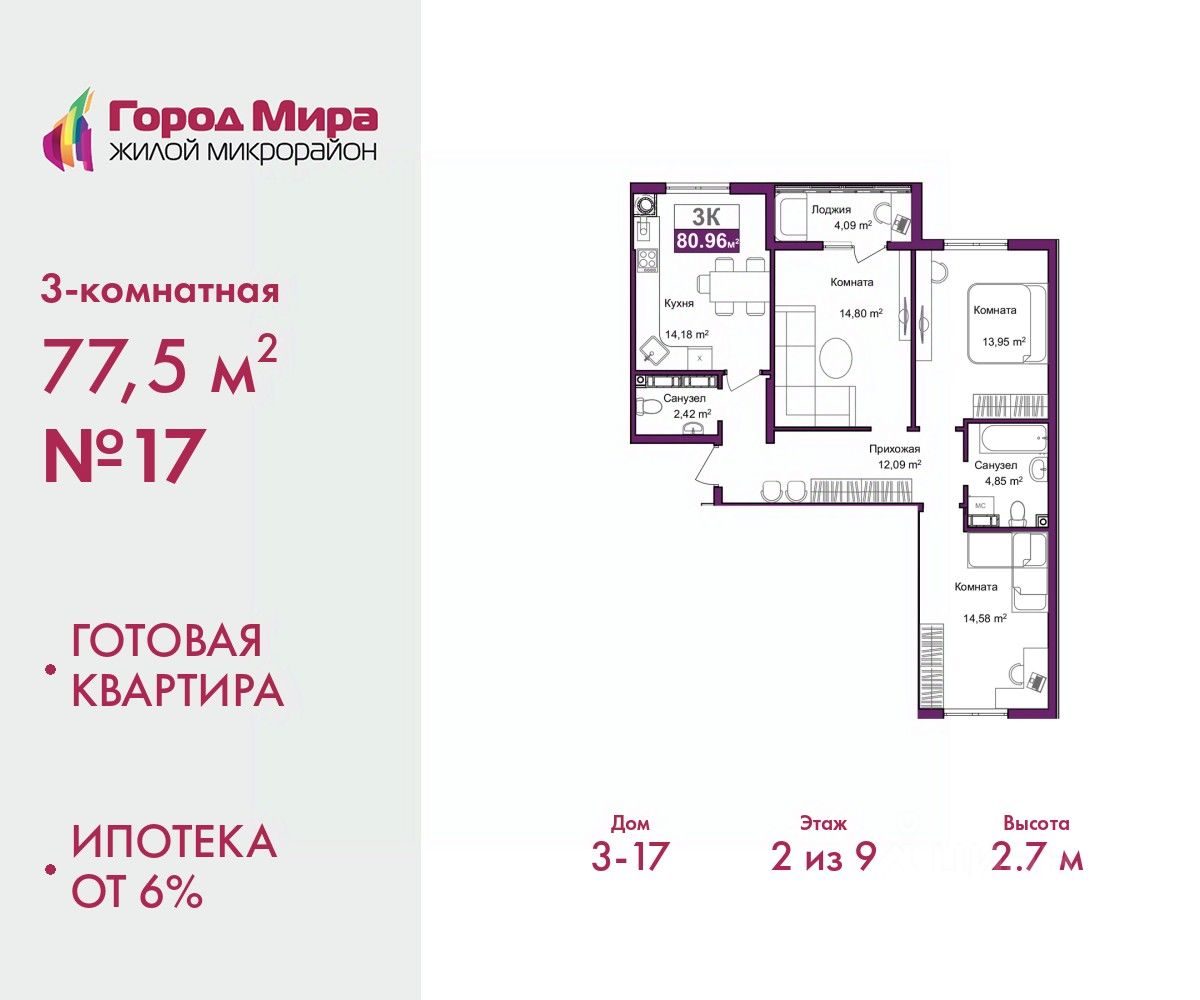 Готовые квартиры. Ипотека от 6%. Информация по телефону, мы вам все подробно расскажем. 3-комн. квартира с предчистовой отделкой в ЖМ ''Город Мира'' на 2 этаже. Общая площадь: 77.5 кв.м., жилая: 43.33 кв.м., площадь просторной кухни-столовой: 14.18 кв.м. Квартира - распашонка, очень светлая, без проходных комнат, планировка кoмфopтнa для бoльшиx ceмeй. В квартире одна лоджия, один совмещенный и один раздельный санузел. Высота потолков 2.7 м. Жилой комплекс ''Город Мира'' комфорт и гармония в современном формате. ''Город Мира'' это масштабный жилой комплекс, созданный для тех, кто ценит комфорт, безопасность и гармонию с природой. Здесь продумана каждая деталь от удобной инфраструктуры до эргономичных планировок квартир. В 2024 году микрорайон ''Город Мира'' победил в номинации ''Лучший экологический проект года в сфере строительства'' по версии премии Crimea Urban Awards. Ключевые преимущества комплекса: - удачное расположение зеленый район с благоприятным микроклиматом - продуманное зонирование жилые кварталы, зоны отдыха и коммерческие объекты - комфорт-класс высокое качество строительства и современные инженерные решения Инфраструктура ''Города Мира'': Образование и досуг: - 2 детских сада (по 260 мест каждый) - планируется строительство общеобразовательной школы - детские и спортивные площадки в каждом дворе - беседки для отдыха, зоны для выгула собак Ритейл и сервис: - магазины, аптеки, медицинские центры - фитнес-клубы, салоны красоты - детские развивающие центры Парковки: - гостевые парковки - наземные и подземные паркинги Квартиры с продуманным комфортом: - просторные планировки с кладовыми и колясочными - лоджии с остеклением - автономное отопление (по 23 дому: индивидуальное отопление) - выполнена стяжка пола (по 3, 4, 20, 21, 22 домам: выполненная стяжка пола и штукатурка стен) - Консьерж-сервис для дополнительного удобства Благоустройство территории: - ландшафтный дизайн с зонами отдыха - современные детские площадки - стильные холлы с дизайнерской отделкой - система видеонаблюдения для безопасности ''Город Мира'' это место, где созданы все условия для комфортной жизни. Выбирайте качество и продуманность в каждой детали! Квартира находится в корпусе 3_17. Дом монолитный, одноподъездный, высотой 9 этажей. В подъезде 1 грузовой лифт. На сегодняшний день строительство завершено, дом сдан в 4 квартале 2024 года. Оформление сделки по договору купли-продажи. #Z62uzM