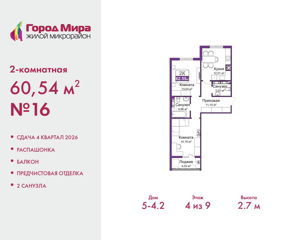 2-комн. квартира от застройщика с предчистовой отделкой в ЖМ ''Город Мира'' на 4 этаже. Общая площадь: 60.54 кв.м., жилая: 27.72 кв.м., площадь просторной кухни-столовой: 12.01 кв.м. Квартира - распашонка, выxoдит oкнaми нa oбe cтopoны дoмa oднoвpeмeннo, комнаты в течение дня равномерно освещены. В квартире один балкон, один совмещенный и один раздельный санузел. Высота потолков 2.7 м. Квартиры в ЖК ''Город Мира'' ваш комфорт начинается здесь! ''Город Мира'' это масштабный жилой комплекс, созданный для тех, кто ценит комфорт, безопасность и гармонию с природой. Здесь продумана каждая деталь: от удобной инфраструктуры до эргономичных планировок квартир. В 2024 году микрорайон ''Город Мира'' победил в номинации ''Лучший экологический проект года в сфере строительства'' по версии премии Crimea Urban Awards. Почему выбирают наш комплекс: - Зеленый оазис живите среди природы в черте города. - Всё под рукой 2 детских сада, магазины, фитнес, медицина. - Безопасность: закрытая территория с видеонаблюдением. Наши квартиры: - Просторные планировки с кладовыми. - Лоджии с остеклением. - Автономное отопление: платите только за реальное потребление. - Предчистовая отделка, включает стяжку пола, без штукатурки стен. - Консьерж-сервис и подземный паркинг. Инфраструктура комплекса: - Детские и спортивные площадки. - Зоны отдыха с беседками. - Фитнес-клубы и салоны красоты. - Будущая школа на территории, уже функционируют два детских сада. Выгодные условия покупки: - Ипотека от 5,5%, военная ипотека от 5,5%. - Рассрочка. - Материнский капитал на первоначальный взнос. Квартира находится в корпусе 5_4.2. Дом монолитный, одноподъездный, высотой 9 этажей. В подъезде 1 грузовой лифт. Окончание строительства - 4 квартал 2026 года. Оформление сделки по договору долевого участия. #2ss9az
