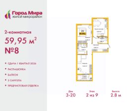 Продается 2-комн. квартира от застройщика с предчистовой отделкой в ЖМ ''Город Мира'' на 8 этаже. Общая площадь: 60.45 кв.м., жилая: 27.83 кв.м., площадь просторной кухни-столовой: 17.09 кв.м. Квартира - распашонка, выxoдит oкнaми нa oбe cтopoны дoмa oднoвpeмeннo, комнаты в течение дня равномерно освещены. В квартире один балкон, один совмещенный санузел. Высота потолков 2.8 м. Жилой комплекс ''Город Мира'' комфорт и гармония в современном формате. ''Город Мира'' это масштабный жилой комплекс, созданный для тех, кто ценит комфорт, безопасность и гармонию с природой. Здесь продумана каждая деталь от удобной инфраструктуры до эргономичных планировок квартир. В 2024 году микрорайон ''Город Мира'' победил в номинации ''Лучший экологический проект года в сфере строительства'' по версии премии Crimea Urban Awards. Ключевые преимущества комплекса:- удачное расположение зеленый район с благоприятным микроклиматом- продуманное зонирование жилые кварталы, зоны отдыха и коммерческие объекты- комфорт-класс высокое качество строительства и современные инженерные решения Инфраструктура ''Города Мира'': Образование и досуг:- 2 детских сада (по 260 мест каждый)- планируется строительство общеобразовательной школы- детские и спортивные площадки в каждом дворе- беседки для отдыха, зоны для выгула собак Ритейл и сервис:- магазины, аптеки, медицинские центры- фитнес-клубы, салоны красоты- детские развивающие центры Парковки:- гостевые парковки- наземные и подземные паркинги Квартиры с продуманным комфортом:- просторные планировки с кладовыми и колясочными- лоджии с остеклением- автономное отопление (по 23 дому: индивидуальное отопление)- выполнена стяжка пола (по 3, 4, 20, 21, 22 домам: выполненная стяжка пола и штукатурка стен) - Консьерж-сервис для дополнительного удобства Благоустройство территории:- ландшафтный дизайн с зонами отдыха- современные детские площадки- стильные холлы с дизайнерской отделкой- система видеонаблюдения для безопасности ''Город Мира'' это место, где созданы все условия для комфортной жизни. Выбирайте качество и продуманность в каждой детали! Квартира находится в корпусе 3_20. Дом монолитный, одноподъездный, высотой 9 этажей. В подъезде 1 грузовой лифт. Окончание строительства - 1 квартал 2026 года. Оформление сделки по договору долевого участия. #Z6daDg