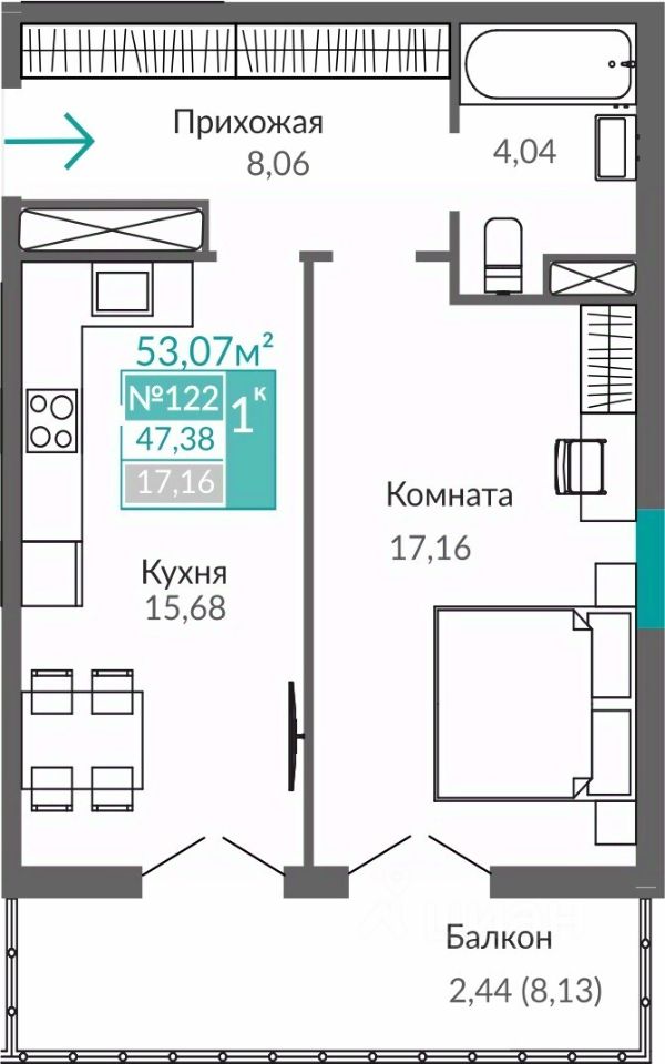 Однокомнатная квартира с предчистовой отделкой в ЖМ ''Город Мира'' на 1 этаже. Общая площадь: 43.91 кв.м., жилая: 14.4 кв.м., площадь просторной кухни-столовой: 18.21 кв.м. Все окна выходят на одну сторону. В квартире один совмещенный санузел. Высота потолков 2.7 м. Квартиры в ЖК ''Город Мира'' ваш комфорт начинается здесь! ''Город Мира'' это масштабный жилой комплекс, созданный для тех, кто ценит комфорт, безопасность и гармонию с природой. Здесь продумана каждая деталь: от удобной инфраструктуры до эргономичных планировок квартир. В 2024 году микрорайон ''Город Мира'' победил в номинации ''Лучший экологический проект года в сфере строительства'' по версии премии Crimea Urban Awards. Почему выбирают наш комплекс: - Зеленый оазис живите среди природы в черте города. - Всё под рукой 2 детских сада, магазины, фитнес, медицина. - Безопасность: закрытая территория с видеонаблюдением. Наши квартиры: - Просторные планировки с кладовыми. - Автономное отопление: платите только за реальное потребление. - Готовая предчистовая отделка: стяжка пола, штукатурка стен (кроме 3, 4 домов, где нет штукатурки стен). - Консьерж-сервис и подземный паркинг. Инфраструктура комплекса: - Детские и спортивные площадки. - Зоны отдыха с беседками. - Фитнес-клубы и салоны красоты. - Будущая школа на территории, уже функционируют два детских сада. Выгодные условия покупки: - Ипотека от 5,5%, военная ипотека от 5,5%. - Рассрочка. - Материнский капитал на первоначальный взнос. Квартира находится в корпусе 5_3.4. Дом монолитный, одноподъездный, высотой 9 этажей. В подъезде 1 грузовой лифт. Окончание строительства - 4 квартал 2026 года. Оформление сделки по договору долевого участия. #zmgIC2