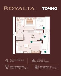 Жилой комплекс ''РОЯЛТА'' включает 5 монолитно-кирпичных девятиэтажных зданий. Проект предлагает квартиры различных планировок: от однокомнатных до трехкомнатных с расширенными балконами и террасами до 13,4 м2. Территория будет благоустроена детскими игровыми и спортивными площадками, гостевой автостоянкой и озеленением, включая газоны, деревья и кустарники. Также появятся современные уличные тренажёры, СПА-комплекс и панорамный инфинити-бассейн. В шаговой доступности находятся центральная набережная Ялты, детские сады, школы, супермаркеты, торговые центры, Ялтинский медицинский колледж, автовокзал и Мордвиновский парк.