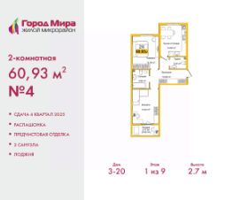 Просторная 2-комн. квартира с предчистовой отделкой в ЖМ ''Город Мира'' на 5 этаже. Общая площадь: 63.52 кв.м., жилая: 33.89 кв.м., площадь просторной кухни-столовой: 10.69 кв.м. Квартира угловая, окна oбecпeчивaют paвнoмepнoe ocвeщeниe в тeчeниe дня. В квартире одна лоджия, один совмещенный и один раздельный санузел. Высота потолков 2.7 м. ''Город Мира'' это масштабный жилой комплекс, созданный для тех, кто ценит комфорт, безопасность и гармонию с природой. Здесь продумана каждая деталь от удобной инфраструктуры до эргономичных планировок квартир. Главные преимущества: Удачное расположение зеленый район с благоприятным микроклиматомПродуманное зонирование жилые кварталы, зоны отдыха и коммерческие объектыКомфорт-класс высокое качество строительства и современные инженерные решения Инфраструктура Города Мира: Образование и досуг:2 детских сада (по 260 мест каждый)Планируется строительство общеобразовательной школыДетские и спортивные площадки в каждом двореБеседки для отдыха, зоны для выгула собак Торговля и сервис:Магазины, аптеки, медицинские центрыФитнес-клубы, салоны красотыДетские развивающие центры Парковки:Гостевые парковкиНаземные и подземные паркинги Благоустройство территории:Ландшафтный дизайн с зонами отдыхаСовременные детские площадкиСтильные холлы с дизайнерской отделкойСистема видеонаблюдения для безопасности. Почему именно 23-й дом?Комфорт и планировки:• Просторные квартиры с двумя санузлами и гардеробными• Увеличенная площадь остекления — максимум света и воздуха• Индивидуальное отопление — комфорт в любое время года Эстетика и стиль:• Дизайнерские входные группы — стиль начинается с порога• Архитектурная подсветка фасада — дом, которым хочется гордиться• Панорамные виды на город и сосновый бор рядом Инфраструктура и удобство:• Консьерж-сервис — дополнительный уровень сервиса и безопасности• Колясочные• Выполнена стяжка пола и штукатурка стен• Центральная локация внутри микрорайона — тишина и доступность Жизнь внутри дома:• Двухэтажный стилобат с коммерцией: магазины, кафе, офисы, студии и даже школа танцев• Современный двор: детский игровой комплекс, зоны отдыха для взрослых, зарядка для электромобилей, зона wi-fi на улице Возможно приобретение в ипотеку по выгодным условиям:• ставка — от 6% годовых• первоначальный взнос — от 20%• срок — до 30 лет• можно использовать материнский капитал даже на первый взнос. Также доступны военная и IT-ипотекаРассрочка от застройщика:• первый взнос от 30%,• равномерные платежи до окончания строительства. Квартира находится в корпусе 3_23. Дом монолитный, одноподъездный, высотой 16 этажей. В подъезде 1 пассажирский и 1 грузовой лифт. Окончание строительства - 4 квартал 2025 года. Оформление сделки по договору долевого участия. #zS5gte