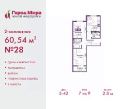 2-комн. квартира с предчистовой отделкой в ЖМ ''Город Мира'' на 2 этаже. Общая площадь: 60.54 кв.м., жилая: 27.72 кв.м., площадь просторной кухни-столовой: 12.01 кв.м. Квартира - распашонка, без проходных комнат, окна выходят на paзные стороны дома. В квартире один балкон, один совмещенный и один раздельный санузел. Высота потолков 2.7 м. Квартиры в ЖК ''Город Мира'' ваш комфорт начинается здесь! ''Город Мира'' это масштабный жилой комплекс, созданный для тех, кто ценит комфорт, безопасность и гармонию с природой. Здесь продумана каждая деталь: от удобной инфраструктуры до эргономичных планировок квартир. В 2024 году микрорайон ''Город Мира'' победил в номинации ''Лучший экологический проект года в сфере строительства'' по версии премии Crimea Urban Awards. Почему выбирают наш комплекс: - Зеленый оазис живите среди природы в черте города.- Всё под рукой 2 детских сада, магазины, фитнес, медицина. - Безопасность: закрытая территория с видеонаблюдением. Наши квартиры: - Просторные планировки с кладовыми. - Автономное отопление: платите только за реальное потребление. - Готовая предчистовая отделка: стяжка пола, штукатурка стен (кроме 3, 4 домов, где нет штукатурки стен). - Консьерж-сервис и подземный паркинг. Инфраструктура комплекса: - Детские и спортивные площадки. - Зоны отдыха с беседками. - Фитнес-клубы и салоны красоты. - Будущая школа на территории, уже функционируют два детских сада. Выгодные условия покупки: - Ипотека от 5,5%, военная ипотека от 5,5%. - Рассрочка. - Материнский капитал на первоначальный взнос. Квартира находится в корпусе 5_42. Дом монолитный, одноподъездный, высотой 9 этажей. В подъезде 1 грузовой лифт. Окончание строительства - 4 квартал 2026 года. Оформление сделки по договору долевого участия. #25TF8f