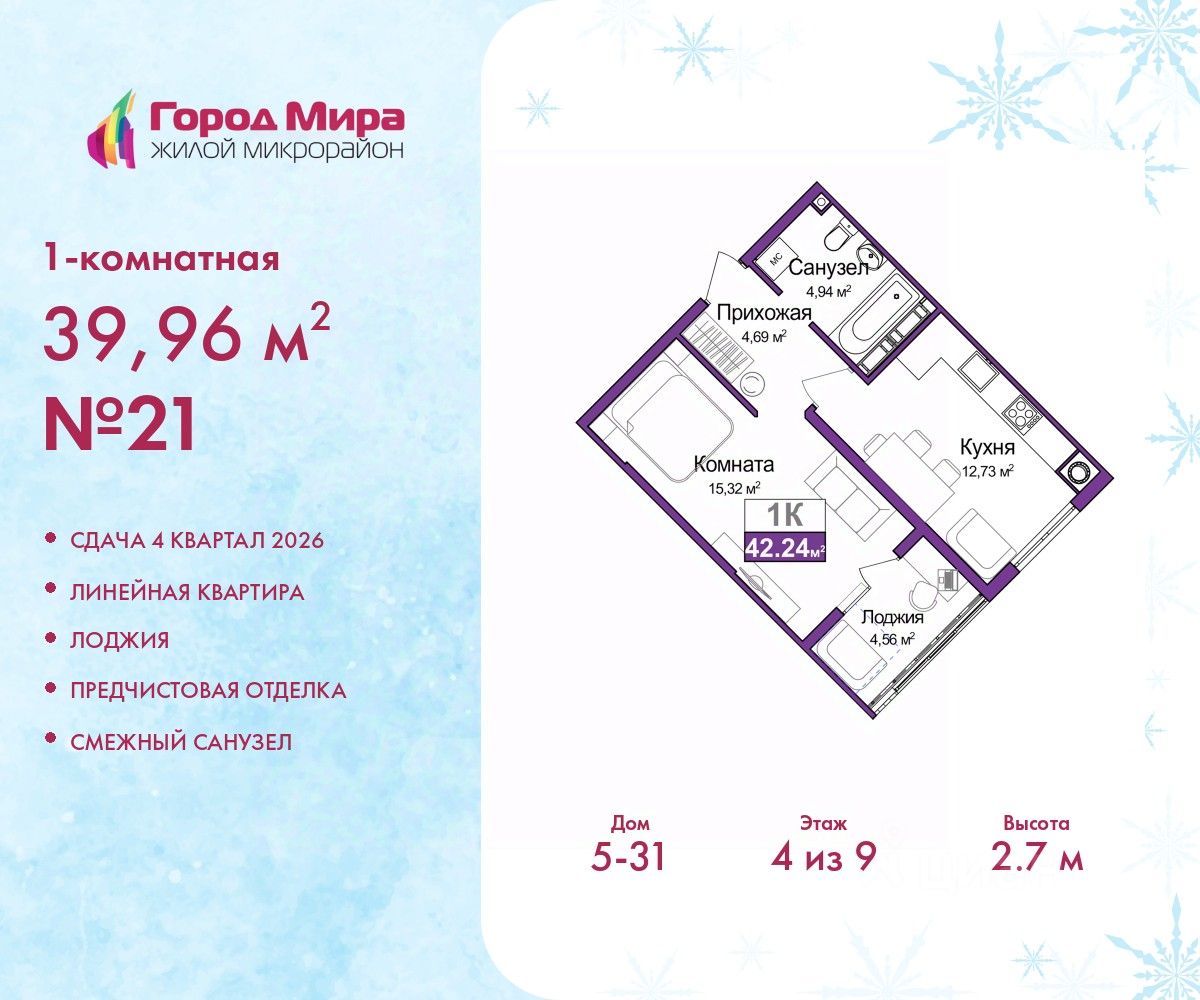 1-комн. квартира от застройщика с предчистовой отделкой в ЖМ ''Город Мира'' на 4 этаже. Общая площадь: 39.96 кв.м., жилая: 15.32 кв.м., площадь просторной кухни-столовой: 12.73 кв.м. Все окна выходят на одну сторону. В квартире одна лоджия, один совмещенный санузел. Высота потолков 2.7 м. Квартиры в ЖК ''Город Мира'' ваш комфорт начинается здесь! ''Город Мира'' это масштабный жилой комплекс, созданный для тех, кто ценит комфорт, безопасность и гармонию с природой. Здесь продумана каждая деталь: от удобной инфраструктуры до эргономичных планировок квартир. В 2024 году микрорайон ''Город Мира'' победил в номинации ''Лучший экологический проект года в сфере строительства'' по версии премии Crimea Urban Awards. Почему выбирают наш комплекс: - Зеленый оазис живите среди природы в черте города. - Всё под рукой 2 детских сада, магазины, фитнес, медицина. - Безопасность: закрытая территория с видеонаблюдением. Наши квартиры: - Просторные планировки с кладовыми. - Автономное отопление: платите только за реальное потребление. - Предчистовая отделка, включает стяжку пола, без штукатурки стен. - Консьерж-сервис и подземный паркинг. Инфраструктура комплекса: - Детские и спортивные площадки. - Зоны отдыха с беседками. - Фитнес-клубы и салоны красоты. - Будущая школа на территории, уже функционируют два детских сада. Выгодные условия покупки: - Ипотека от 5,5%, военная ипотека от 5,5%. - Рассрочка. - Материнский капитал на первоначальный взнос. Квартира находится в корпусе 5_31. Дом монолитный, одноподъездный, высотой 9 этажей. В подъезде 1 грузовой лифт. Окончание строительства - 4 квартал 2026 года. Оформление сделки по договору долевого участия. #zM9AVz