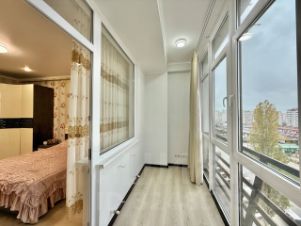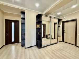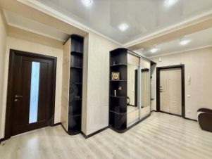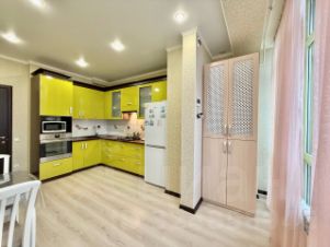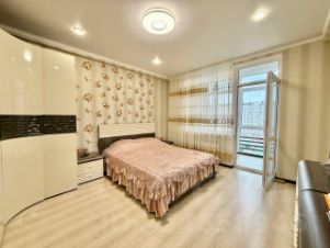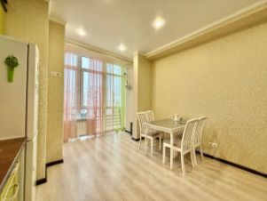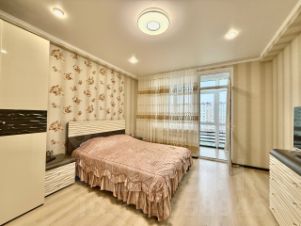 Просторная, светлая, теплая двухкомнатная квартира, перепланированная в студию евро-трешку, находится на пятом этаже, южная сторона с видом во двор и на море, 12-ти этажного каркасно-монолитного двух-подъездного жилого дома клубного типа, 2012 года постройки с закрытой охраняемой благоустроенной территорией, по адресу: г. Евпатория, ул. Интернациональная, 130. Дом расположен в современном деловом центре города Евпатория. (Район ''Универсам''). В шаговой доступности: рынок, торговый центр, ТЦ ''ПУД'', ТЦ ''О'Фреш'', ТЦ ''Эльдорадо'', школа 16, строится детсад, парк ''Красная горка'', озеро Мойнаки. В ухоженном озелененном подъезде два лифта, на входе установлен домофон с управлением через мобильный телефон. На каждом этаже балкон общего пользования. Общая площадь квартиры: согласно выписки ЕГРН: 90,90 кв.м., по техпаспорту: 94,90 кв.м.. В квартире свободной планировки (после строителей) никто не жил, в 2021 году впервые начаты и в 2022 году завершены работы по отделке и оборудованию квартиры современными качественными отделочными материалами, выполнена перепланировка, в результате чего фактическая площадь квартиры составила: 103 кв.м, в том числе: прихожая 15,7 кв.м, гостиная кухня 45,37 кв.м, мастер-спальня 14,68 кв.м, гостевая спальня-кабинет 14,33 кв.м, ванная комната 7,7 кв.м, туалет 3,35 кв.м, техническое помещение (котельная) 1,93 кв.м. Высота потолков 3,7 м. Наружное витражное остекление (''французский балкон''), выполнено пяти-камерным металлопластиковым профилем, двухкамерным стеклопакетом с мультифункциональным напылением на наружном стекле, в гостиной-кухне (6,2 м х 2,56 м) и в мастер-спальне (1,77 м х 2,25 м), что обеспечивает великолепный вид из гостиной и спальни и прекрасную инсоляцию всей квартиры, надежную теплоизоляцию. Квартира полностью по всему периметру утеплена и звукоизолирована, что обеспечивает комфортное проживание с минимизированными счетами за потребленную электроэнергию, в квартире установлено новое, современное и экономичное оборудование: трехфазное электроснабжение высокой степени надежности и защиты (основной трех-фазный электро-щит на 31 автомата и электро-щит в технической комнате на 2 автомата), современное светодиодное освещение всех помещений, в котельной установлены: трех-фазный электрический водогрейный котел Proterm 12 RT/ 14 RU, UA (Словакия), водонагреватель (бойлер) косвенного нагрева Gorenje 120 л, Словения, система водоподготовки и водоочистки. Отопление квартиры построено на основе системы водяного теплого пола: в прихожей, гостиной-кухне, санузлах, а также на биметаллических радиаторах отопления в мастер-спальне и гостевой спальне (кабинете). Кондиционирование воздуха (обогрев и охлаждение) на основе оборудования TOSOT: 2 сплит системы по 07 в спальнях и кондиционер на 18 в гостиной-кухне, принудительная вентиляция в санузлах и кухне. Гостиная-кухня оборудована индивидуально изготовленной встроенной модульной кухней Rehau, (31 шкафа, оборудованных подъемными механизмами Blum и выдвижными механизма