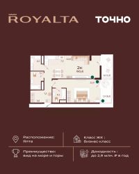Квартира в ЖК Никитский дворец — простор, вид на море и дизайнерская эстетикаСветлая и стильная 2-комнатная квартира площадью 69 м² в престижном комплексе Никитский дворец.Квартира расположена на 8 этаже из 11 этажей О квартире:• продуманная планировка — 2 комнаты, кухня-гостиная• гардеробная • два санузла• просторный видовой балкон с панорамами моря, гор и зелёного массива• дизайнерская отделка в спокойных тонах• полностью укомплектована мебелью и техникой — можно заезжать и жить О комплексе Никитский дворец:• закрытая благоустроенная территория• собственный пляж в 500 метрах• спортивные и детские площадки• подземный и наземный паркинг• охрана 24/7• качественные инженерные сети и автономное отопление комплекса Локация:Посёлок Отрадное — один из самых зелёных и экологичных районов Большой Ялты.Рядом Никитский ботанический сад и прогулочные маршруты.