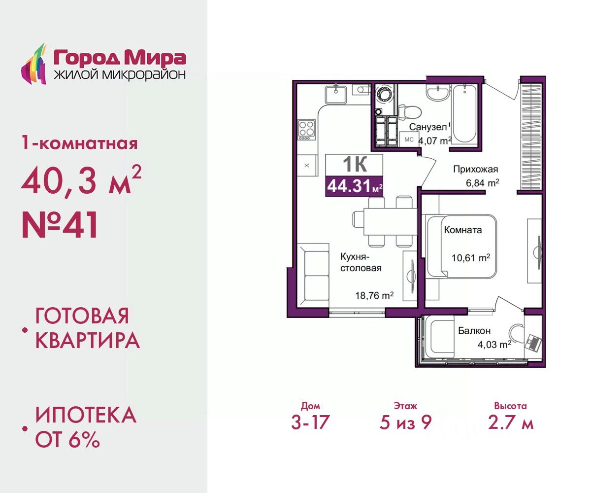 Готовые квартиры. Ипотека от 6%. Информация по телефону, наши менеджеры вам все расскажут. 1-комн. квартира от застройщика с предчистовой отделкой в ЖМ ''Город Мира'' на 5 этаже. Общая площадь: 40.3 кв.м., жилая: 10.61 кв.м., площадь просторной кухни-столовой: 18.76 кв.м. Все окна выходят на одну сторону. В квартире один балкон, один совмещенный санузел. Высота потолков 2.7 м. Жилой комплекс ''Город Мира'' комфорт и гармония в современном формате. ''Город Мира'' это масштабный жилой комплекс, созданный для тех, кто ценит комфорт, безопасность и гармонию с природой. Здесь продумана каждая деталь от удобной инфраструктуры до эргономичных планировок квартир. В 2024 году микрорайон ''Город Мира'' победил в номинации ''Лучший экологический проект года в сфере строительства'' по версии премии Crimea Urban Awards. Ключевые преимущества комплекса: - удачное расположение зеленый район с благоприятным микроклиматом - продуманное зонирование жилые кварталы, зоны отдыха и коммерческие объекты - комфорт-класс высокое качество строительства и современные инженерные решения Инфраструктура ''Города Мира'': Образование и досуг: - 2 детских сада (по 260 мест каждый) - планируется строительство общеобразовательной школы - детские и спортивные площадки в каждом дворе - беседки для отдыха, зоны для выгула собак Ритейл и сервис: - магазины, аптеки, медицинские центры - фитнес-клубы, салоны красоты - детские развивающие центры Парковки: - гостевые парковки - наземные и подземные паркинги Квартиры с продуманным комфортом: - просторные планировки с кладовыми и колясочными - лоджии с остеклением - автономное отопление (по 23 дому: индивидуальное отопление) - выполнена стяжка пола (по 3, 4, 20, 21, 22 домам: выполненная стяжка пола и штукатурка стен) - Консьерж-сервис для дополнительного удобства Благоустройство территории: - ландшафтный дизайн с зонами отдыха - современные детские площадки - стильные холлы с дизайнерской отделкой - система видеонаблюдения для безопасности ''Город Мира'' это место, где созданы все условия для комфортной жизни. Выбирайте качество и продуманность в каждой детали! Квартира находится в корпусе 3_17. Дом монолитный, одноподъездный, высотой 9 этажей. В подъезде 1 грузовой лифт. Строительство окончено, дом сдан в 4 квартале 2024 года. Оформление сделки по договору купли-продажи. #26aU5g