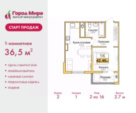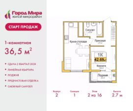 Просторная 2-комн. квартира с европланировкой и предчистовой отделкой в ЖМ ''Город Мира'' на 2 этаже. Общая площадь: 42.69 кв.м., жилая: 17.46 кв.м., суммарная площадь гостиной-столовой с кухонной зоной: 17.54 кв.м. Европланировка, за счет большой площади кухни-гостиной квартира выглядит просторной и очень удобна для жизни. Комнаты изолированные, все окна выходят на одну сторону. В квартире один балкон, один совмещенный санузел. Высота потолков 2.7 м. ''Город Мира'' это масштабный жилой комплекс, созданный для тех, кто ценит комфорт, безопасность и гармонию с природой. Здесь продумана каждая деталь от удобной инфраструктуры до эргономичных планировок квартир. ''Город Мира'' победил в номинации ''Лучший экологический проект года в сфере строительства'' по версии премии Сrimеа Urbаn Аwаrds. Способы приобретения недвижимости в ''Городе Мира'':1. Ипотека: семейная от 5,5%, военная, IT-ипотека, базовая ипотечная программа и комбо-ипотека. Одобрение заявки проходит сразу в отделе продаж. 2. Материнский капитал на первый взнос.3. Рассрочка от застройщика - до июня 2028 года! Первоначальный взнос от 30%.4. Военная ипотека. Участники НИС могут приобрести квартиры по спец.цене. Ключевые преимущества комплекса:удачное расположение зеленый район с благоприятным микроклиматомпродуманное зонирование жилые кварталы, зоны отдыха и коммерческие объектыкомфорт-класс высокое качество строительства и современные инженерные решения Почему дом повышенной комфортности 2 в ''Городе Мира'' это лучшее решение? Образование и досуг: 2 детских сада (по 260 мест каждый) планируется строительство общеобразовательной школы детские и спортивные площадки в каждом дворе беседки для отдыха, зоны для выгула собак Ритейл и сервис: магазины, аптеки, медицинские центры фитнес-клубы, салоны красоты детские развивающие центры Парковки: гостевые парковки наземные и подземные паркинги Квартиры с продуманным комфортом: просторные планировки с кладовыми и колясочными лоджии с остеклением лапомойки для питомцев на первых этажах домов индивидуальное отопление выполнена стяжка пола и штукатурка стен консьерж-сервис для дополнительного удобства Благоустройство территории: ландшафтный дизайн с зонами отдыха современные детские площадки стильные холлы с дизайнерской отделкой система видеонаблюдения для безопасности ''Город Мира'' это место, где созданы все условия для комфортной жизни. Выбирайте качество и продуманность в каждой детали! Квартира находится во доме повышенной комфортности 2, 4-я очередь. Дом монолитно-каркасный, одноподъездный, высотой 16 этажей. В подъезде 1 пассажирский и 1 грузовой лифт. Окончание строительства - 2 квартал 2028 года. Оформление сделки по договору долевого участия. Квартира находится в корпусе 2. Дом монолитный, одноподъездный, высотой 16 этажей. На этаже 7 квартир. В подъезде 1 пассажирский и 1 грузовой лифт. Окончание строительства - 2 квартал 2028 года. Оформление сделки по договору долевого участия. #Z
