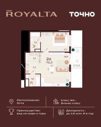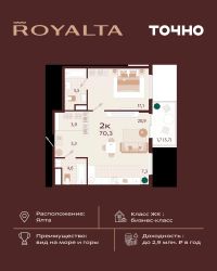 Жилой комплекс ''РОЯЛТА'' включает 5 монолитно-кирпичных девятиэтажных зданий. Проект предлагает квартиры различных планировок: от однокомнатных до трехкомнатных с расширенными балконами и террасами до 13,4 м2. Территория будет благоустроена детскими игровыми и спортивными площадками, гостевой автостоянкой и озеленением, включая газоны, деревья и кустарники. Также появятся современные уличные тренажёры, СПА-комплекс и панорамный инфинити-бассейн. В шаговой доступности находятся центральная набережная Ялты, детские сады, школы, супермаркеты, торговые центры, Ялтинский медицинский колледж, автовокзал и Мордвиновский парк.