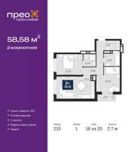 Двухкомнатная квартира с предчистовой отделкой в ЖК ''Прео'' на 16 этаже. Общая площадь: 58.58 кв.м., жилая: 22.23 кв.м., площадь просторной кухни-столовой: 17.51 кв.м. Квартира угловая, идеально подойдет любителям тишины и панорамных видов. В квартире одна лоджия, два совмещенных санузла. Высота потолков 2.7 м. Квартира находится в корпусе 215. Дом монолитный, одноподъездный, высотой 20 этажей. На этаже 8 квартир. В подъезде 1 пассажирский и 1 грузовой лифт. Окончание строительства - 4 квартал 2027 года. Оформление сделки по договору долевого участия. Преображенский — один из самых привлекательных районов для жизни! Это полностью самостоятельный жилой район с точки зрения инфраструктуры. Преображенский находится между Московским и Червишевским трактами в квартале улиц Закалужская — Вьюжная — Александра Протозанова. Не нужно ждать, когда появится инфраструктура — переезжайте на всё готовое. Вблизи расположены действующие школа и детский сад. В этом году откроется еще один сад, а в следующем году — школа. По соседству с Преображенским запланировано строительство городского парка ''Комарово'' площадью 38 гектар. За 10 минут можно доехать на автомобиле до крупных ТРЦ: ''Лента'', ''Кристалл'', ''Леруа Мерлен'', ''Метро'' и ''Ашан''. С 2018 года в районе открыт Соседский центр — пространство, созданное для формирования добрососедской среды, совместного досуга, общения и реализации соседских инициатив. Здесь проходят встречи соседей, а также сами жители района организовывают мероприятия. Организатором такого события может стать любой желающий. В квартирах выполнена качественная предчистовая отделка. Гладкие стены с финишным выравниванием по маякам. Ровный потолок для установки натяжного потолка. Установлены пятикамерные окна с двойным стеклопакетом (3 стекла). Дизайнерские холлы с видеонаблюдением, безбарьерным и прозрачным входом всегда светло и спокойно. На первом этаже есть просторные колясочные, где все жители могут оставлять свои коляски и велосипеды. В Преображенском есть всё, что нужно для активного отдыха и занятий спортом. Мы сделали большое футбольное поле с безопасным покрытием. Также установили хоккейный корт, который оборудован по всем необходимым стандартам. Во дворах можно делать упражнения на специальных площадках с турниками. Весь район мы обустроили велодорожками, которые связаны в единый маршрут. У нас есть сухие фонтаны, бьющие из земли, деревья, веревки, сетки, скалодром, газон, песок и резинка — осталось просто дать своему ребенку право на свободную игру. По-настоящему хорошие дворы — это те, которые дети предпочитают соцсетям и телевизору. Аккредитация в банках: ОАО ''Альфа-Банк'', ПАО ''Банк Уралсиб'', ПАО ''Газпромбанк'', ПАО Банк ''ВТБ'', ''Сбербанк России'' и других. #ZmvgTt