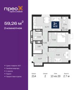 Продается двухкомнатная квартира от застройщика с предчистовой отделкой в ЖК ''Прео'' на 13 этаже. Общая площадь: 59.26 кв.м., жилая: 23.26 кв.м., площадь просторной кухни-столовой: 15.77 кв.м. Комнаты изолированные, все окна выходят на одну сторону. В квартире одна лоджия, один совмещенный и один раздельный санузел. Высота потолков 2.7 м. Дом монолитный, двухподъездный, переменной этажности, от 12 до 20 этажей. Квартира находится во 2-й секции высотой 20 этажей в корпусе 214. На этаже 8 квартир. В подъезде 1 пассажирский и 1 грузовой лифт. Окончание строительства - 4 квартал 2027 года. Оформление сделки по договору долевого участия. Преображенский — один из самых привлекательных районов для жизни! Это полностью самостоятельный жилой район с точки зрения инфраструктуры. Преображенский находится между Московским и Червишевским трактами в квартале улиц Закалужская — Вьюжная — Александра Протозанова. Не нужно ждать, когда появится инфраструктура — переезжайте на всё готовое. Вблизи расположены действующие школа и детский сад. В этом году откроется еще один сад, а в следующем году — школа. По соседству с Преображенским запланировано строительство городского парка ''Комарово'' площадью 38 гектар. За 10 минут можно доехать на автомобиле до крупных ТРЦ: ''Лента'', ''Кристалл'', ''Леруа Мерлен'', ''Метро'' и ''Ашан''. С 2018 года в районе открыт Соседский центр — пространство, созданное для формирования добрососедской среды, совместного досуга, общения и реализации соседских инициатив. Здесь проходят встречи соседей, а также сами жители района организовывают мероприятия. Организатором такого события может стать любой желающий. В квартирах выполнена качественная предчистовая отделка. Гладкие стены с финишным выравниванием по маякам. Ровный потолок для установки натяжного потолка. Установлены пятикамерные окна с двойным стеклопакетом (3 стекла). Дизайнерские холлы с видеонаблюдением, безбарьерным и прозрачным входом всегда светло и спокойно. На первом этаже есть просторные колясочные, где все жители могут оставлять свои коляски и велосипеды. В Преображенском есть всё, что нужно для активного отдыха и занятий спортом. Мы сделали большое футбольное поле с безопасным покрытием. Также установили хоккейный корт, который оборудован по всем необходимым стандартам. Во дворах можно делать упражнения на специальных площадках с турниками. Весь район мы обустроили велодорожками, которые связаны в единый маршрут. У нас есть сухие фонтаны, бьющие из земли, деревья, веревки, сетки, скалодром, газон, песок и резинка — осталось просто дать своему ребенку право на свободную игру. По-настоящему хорошие дворы — это те, которые дети предпочитают соцсетям и телевизору. Аккредитация в банках: ПАО ''Банк Уралсиб'', ОАО ''Альфа-Банк'', ПАО Банк ''ВТБ'', ''Сбербанк России'', ПАО ''Газпромбанк'' и других. #Zmvg8o