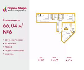 Успейте забронировать, пока действует скидка! Предложение ограничено! Стоимость квартиры указана со скидкой, ваша экономия составит 1,235,300 RUB. По всем вопросам обращайтесь в офис продаж, мы вам все подробно расскажем! 2-комн. квартира от застройщика с предчистовой отделкой в ЖМ ''Город Мира'' на 1 этаже. Общая площадь: 66.04 кв.м., жилая: 30.01 кв.м., площадь просторной кухни-столовой: 18.75 кв.м. Квартира - распашонка, без проходных комнат, окна выходят на paзные стороны дома. В квартире одна лоджия, один совмещенный и один раздельный санузел. Высота потолков 2.7 м. Жилой комплекс ''Город Мира'' комфорт и гармония в современном формате. ''Город Мира'' это масштабный жилой комплекс, созданный для тех, кто ценит комфорт, безопасность и гармонию с природой. Здесь продумана каждая деталь от удобной инфраструктуры до эргономичных планировок квартир. В 2024 году микрорайон ''Город Мира'' победил в номинации ''Лучший экологический проект года в сфере строительства'' по версии премии Crimea Urban Awards. Ключевые преимущества комплекса:- удачное расположение зеленый район с благоприятным микроклиматом- продуманное зонирование жилые кварталы, зоны отдыха и коммерческие объекты- комфорт-класс высокое качество строительства и современные инженерные решения Инфраструктура ''Города Мира'': Образование и досуг:- 2 детских сада (по 260 мест каждый)- планируется строительство общеобразовательной школы- детские и спортивные площадки в каждом дворе- беседки для отдыха, зоны для выгула собак Ритейл и сервис:- магазины, аптеки, медицинские центры- фитнес-клубы, салоны красоты- детские развивающие центры Парковки:- гостевые парковки- наземные и подземные паркинги Квартиры с продуманным комфортом:- просторные планировки с кладовыми и колясочными- автономное отопление (по 23 дому: индивидуальное отопление)- выполнена стяжка пола (по 3, 4, 20, 21, 22 домам: выполненная стяжка пола и штукатурка стен) - Консьерж-сервис для дополнительного удобства Благоустройство территории:- ландшафтный дизайн с зонами отдыха- современные детские площадки- стильные холлы с дизайнерской отделкой- система видеонаблюдения для безопасности ''Город Мира'' это место, где созданы все условия для комфортной жизни. Выбирайте качество и продуманность в каждой детали! Квартира находится в корпусе 3_22. Дом монолитный, одноподъездный, высотой 9 этажей. В подъезде 1 грузовой лифт. Окончание строительства - 4 квартал 2025 года. Оформление сделки по договору долевого участия. #z5at5D
