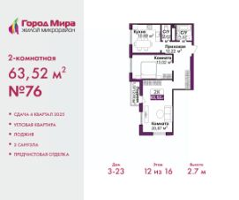 2-комн. квартира с предчистовой отделкой в ЖМ ''Город Мира'' на 12 этаже. Общая площадь: 63.52 кв.м., жилая: 33.89 кв.м., площадь просторной кухни-столовой: 10.69 кв.м. Угловая квартира, идеально подойдет любителям тишины и панорамных видов. В квартире одна лоджия, один совмещенный и один раздельный санузел. Высота потолков 2.7 м. ''Город Мира'' это масштабный жилой комплекс, созданный для тех, кто ценит комфорт, безопасность и гармонию с природой. Здесь продумана каждая деталь от удобной инфраструктуры до эргономичных планировок квартир. Главные преимущества: Удачное расположение зеленый район с благоприятным микроклиматомПродуманное зонирование жилые кварталы, зоны отдыха и коммерческие объектыКомфорт-класс высокое качество строительства и современные инженерные решения Инфраструктура Города Мира: Образование и досуг:2 детских сада (по 260 мест каждый)Планируется строительство общеобразовательной школыДетские и спортивные площадки в каждом двореБеседки для отдыха, зоны для выгула собак Торговля и сервис:Магазины, аптеки, медицинские центрыФитнес-клубы, салоны красотыДетские развивающие центры Парковки:Гостевые парковкиНаземные и подземные паркинги Благоустройство территории:Ландшафтный дизайн с зонами отдыхаСовременные детские площадкиСтильные холлы с дизайнерской отделкойСистема видеонаблюдения для безопасности. Почему именно 23-й дом?Комфорт и планировки:• Просторные квартиры с двумя санузлами и гардеробными• Увеличенная площадь остекления — максимум света и воздуха• Индивидуальное отопление — комфорт в любое время года Эстетика и стиль:• Дизайнерские входные группы — стиль начинается с порога• Архитектурная подсветка фасада — дом, которым хочется гордиться• Панорамные виды на город и сосновый бор рядом Инфраструктура и удобство:• Консьерж-сервис — дополнительный уровень сервиса и безопасности• Колясочные• Выполнена стяжка пола и штукатурка стен• Центральная локация внутри микрорайона — тишина и доступность Жизнь внутри дома:• Двухэтажный стилобат с коммерцией: магазины, кафе, офисы, студии и даже школа танцев• Современный двор: детский игровой комплекс, зоны отдыха для взрослых, зарядка для электромобилей, зона wi-fi на улице Возможно приобретение в ипотеку по выгодным условиям:• ставка — от 6% годовых• первоначальный взнос — от 20%• срок — до 30 лет• можно использовать материнский капитал даже на первый взнос. Также доступны военная и IT-ипотекаРассрочка от застройщика:• первый взнос от 30%,• равномерные платежи до окончания строительства. Квартира находится в корпусе 3_23. Дом монолитный, одноподъездный, высотой 16 этажей. В подъезде 1 пассажирский и 1 грузовой лифт. Окончание строительства - 4 квартал 2025 года. Оформление сделки по договору долевого участия. #Z6zUUz