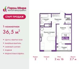 2-комн. квартира с европланировкой и предчистовой отделкой в ЖМ ''Город Мира'' на 9 этаже. Общая площадь: 45.16 кв.м., жилая: 18.22 кв.м., суммарная площадь гостиной-столовой с кухонной зоной: 15.82 кв.м. Европейская планировка, зона гостиной комнаты объединена с кухней. Комнаты изолированные, все окна выходят на одну сторону. В квартире одна лоджия, один совмещенный санузел. Высота потолков 2.7 м. ''Город Мира'' это масштабный жилой комплекс, созданный для тех, кто ценит комфорт, безопасность и гармонию с природой. Здесь продумана каждая деталь от удобной инфраструктуры до эргономичных планировок квартир. ''Город Мира'' победил в номинации ''Лучший экологический проект года в сфере строительства'' по версии премии Сrimеа Urbаn Аwаrds. Способы приобретения недвижимости в ''Городе Мира'':1. Ипотека: семейная от 5,5%, военная, IT-ипотека, базовая ипотечная программа и комбо-ипотека. Одобрение заявки проходит сразу в отделе продаж. 2. Материнский капитал на первый взнос.3. Рассрочка от застройщика - до июня 2028 года! Первоначальный взнос от 30%.4. Военная ипотека. Участники НИС могут приобрести квартиры по спец.цене. Ключевые преимущества комплекса:удачное расположение зеленый район с благоприятным микроклиматомпродуманное зонирование жилые кварталы, зоны отдыха и коммерческие объектыкомфорт-класс высокое качество строительства и современные инженерные решения Почему дом повышенной комфортности 2 в ''Городе Мира'' это лучшее решение? Образование и досуг: 2 детских сада (по 260 мест каждый) планируется строительство общеобразовательной школы детские и спортивные площадки в каждом дворе беседки для отдыха, зоны для выгула собак Ритейл и сервис: магазины, аптеки, медицинские центры фитнес-клубы, салоны красоты детские развивающие центры Парковки: гостевые парковки наземные и подземные паркинги Квартиры с продуманным комфортом: просторные планировки с кладовыми и колясочными лоджии с остеклением лапомойки для питомцев на первых этажах домов индивидуальное отопление выполнена стяжка пола и штукатурка стен консьерж-сервис для дополнительного удобства Благоустройство территории: ландшафтный дизайн с зонами отдыха современные детские площадки стильные холлы с дизайнерской отделкой система видеонаблюдения для безопасности ''Город Мира'' это место, где созданы все условия для комфортной жизни. Выбирайте качество и продуманность в каждой детали! Квартира находится во доме повышенной комфортности 2, 4-я очередь. Дом монолитно-каркасный, одноподъездный, высотой 16 этажей. В подъезде 1 пассажирский и 1 грузовой лифт. Окончание строительства - 2 квартал 2028 года. Оформление сделки по договору долевого участия. Квартира находится в корпусе 2. Дом монолитный, одноподъездный, высотой 16 этажей. На этаже 7 квартир. В подъезде 1 пассажирский и 1 грузовой лифт. Окончание строительства - 2 квартал 2028 года. Оформление сделки по договору долевого участия. #zme2gA