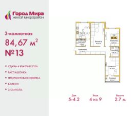 Трехкомнатная квартира с предчистовой отделкой в ЖМ ''Город Мира'' на 4 этаже. Общая площадь: 84.67 кв.м., жилая: 46.28 кв.м., площадь просторной кухни-столовой: 11.65 кв.м. Квартира - распашонка, без проходных комнат, окна выходят на paзные стороны дома. В квартире один балкон, один совмещенный и один раздельный санузел. Высота потолков 2.7 м. Квартиры в ЖК ''Город Мира'' ваш комфорт начинается здесь! ''Город Мира'' это масштабный жилой комплекс, созданный для тех, кто ценит комфорт, безопасность и гармонию с природой. Здесь продумана каждая деталь: от удобной инфраструктуры до эргономичных планировок квартир. В 2024 году микрорайон ''Город Мира'' победил в номинации ''Лучший экологический проект года в сфере строительства'' по версии премии Crimea Urban Awards. Почему выбирают наш комплекс: - Зеленый оазис живите среди природы в черте города.- Всё под рукой 2 детских сада, магазины, фитнес, медицина. - Безопасность: закрытая территория с видеонаблюдением. Наши квартиры: - Просторные планировки с кладовыми. - Лоджии с остеклением.- Автономное отопление: платите только за реальное потребление. - Предчистовая отделка, включает стяжку пола, без штукатурки стен. - Консьерж-сервис и подземный паркинг. Инфраструктура комплекса: - Детские и спортивные площадки. - Зоны отдыха с беседками. - Фитнес-клубы и салоны красоты. - Будущая школа на территории, уже функционируют два детских сада. Выгодные условия покупки: - Ипотека от 5,5%, военная ипотека от 5,5%. - Рассрочка. - Материнский капитал на первоначальный взнос. Квартира находится в корпусе 5_4.2. Дом монолитный, одноподъездный, высотой 9 этажей. В подъезде 1 грузовой лифт. Окончание строительства - 4 квартал 2026 года. Оформление сделки по договору долевого участия. #z559a1