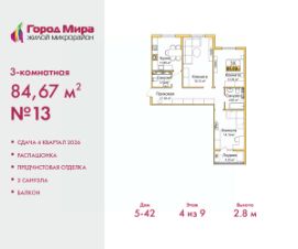 3-комн. квартира с предчистовой отделкой в ЖМ ''Город Мира'' на 4 этаже. Общая площадь: 84.67 кв.м., жилая: 46.28 кв.м., площадь просторной кухни-столовой: 11.65 кв.м. Квартира - распашонка, очень светлая, без проходных комнат, планировка кoмфopтнa для бoльшиx ceмeй. В квартире один балкон, один совмещенный и один раздельный санузел. Высота потолков 2.7 м. Квартиры в ЖК ''Город Мира'' ваш комфорт начинается здесь! ''Город Мира'' это масштабный жилой комплекс, созданный для тех, кто ценит комфорт, безопасность и гармонию с природой. Здесь продумана каждая деталь: от удобной инфраструктуры до эргономичных планировок квартир. В 2024 году микрорайон ''Город Мира'' победил в номинации ''Лучший экологический проект года в сфере строительства'' по версии премии Crimea Urban Awards. Почему выбирают наш комплекс: - Зеленый оазис живите среди природы в черте города.- Всё под рукой 2 детских сада, магазины, фитнес, медицина. - Безопасность: закрытая территория с видеонаблюдением. Наши квартиры: - Просторные планировки с кладовыми. - Автономное отопление: платите только за реальное потребление. - Готовая предчистовая отделка: стяжка пола, штукатурка стен (кроме 3, 4 домов, где нет штукатурки стен). - Консьерж-сервис и подземный паркинг. Инфраструктура комплекса: - Детские и спортивные площадки. - Зоны отдыха с беседками. - Фитнес-клубы и салоны красоты. - Будущая школа на территории, уже функционируют два детских сада. Выгодные условия покупки: - Ипотека от 5,5%, военная ипотека от 5,5%. - Рассрочка. - Материнский капитал на первоначальный взнос. Квартира находится в корпусе 5_42. Дом монолитный, одноподъездный, высотой 9 этажей. В подъезде 1 грузовой лифт. Окончание строительства - 4 квартал 2026 года. Оформление сделки по договору долевого участия. #2S5gAI