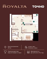 ЖК ''Sky Plaza 5.0'' - это пятая очередь премиального комплекса апартаментов, расположенного на живописном побережье Черного моря. Этот уникальный проект сочетает в себе современные технологии строительства, изысканный дизайн и безупречный комфорт.Здание представляет собой монолитный блок с волнообразным фасадом, который гармонично вписывается в морской пейзаж, создавая ощущение легкости и элегантности.Комплекс состоит из 8 этажей, два из которых отведены под подземные паркинги, а 6 этажей - под роскошные апартаменты площадью от 39 до 192 кв. метров.Ваш новый дом у моря ждет вас! Подарите себе и своим близким возможность жить в окружении красоты, комфорта и роскоши.Панорамное остекление и открытые широкие балконы-террасы с прозрачными стеклянными ограждениями дарят потрясающие виды на море и окружающие пейзажи.Рядом с комплексом находится знаменитый Массандровский парк - настоящий шедевр садово-паркового искусства, где можно насладиться прогулками среди вековых деревьев и живописных аллей.Всего в 15 минутах пешком вас ждет Ялтинская набережная - сердце города, где каждый вечер можно ощутить неповторимую атмосферу крымского променада. А любители морского отдыха оценят близость пляжа.Всего в 80 метрах от дома вас ждет собственный пляж Sky Beach, оборудованный всей необходимой инфраструктурой: бассейны, уютные кафе, рестораны с видом на море и многое другое.В шаговой доступности расположены магазины, аптека, современный тренажерный зал и аквапарк, что делает жизнь здесь максимально удобной и насыщенной.Для владельцев автомобилей предусмотрена двухуровневая подземная парковка. Теперь маршрут от парковочного места до квартиры существенно сокращен, и быстрый спуск на лифте к личному транспортному средству займет не более 5 минут.Для вашего комфорта здесь предусмотрена централизованная система вентиляции и кондиционирования, а также собственная мини-котельная, обеспечивающая тепло и уют в любое время года.Высота потолков в 3 метра создает ощущение простора и свободы.ЖК ''Sky Plaza 5.0'' - это не просто жилье, это стиль жизни, где каждая деталь создана для вашего удовольствия!