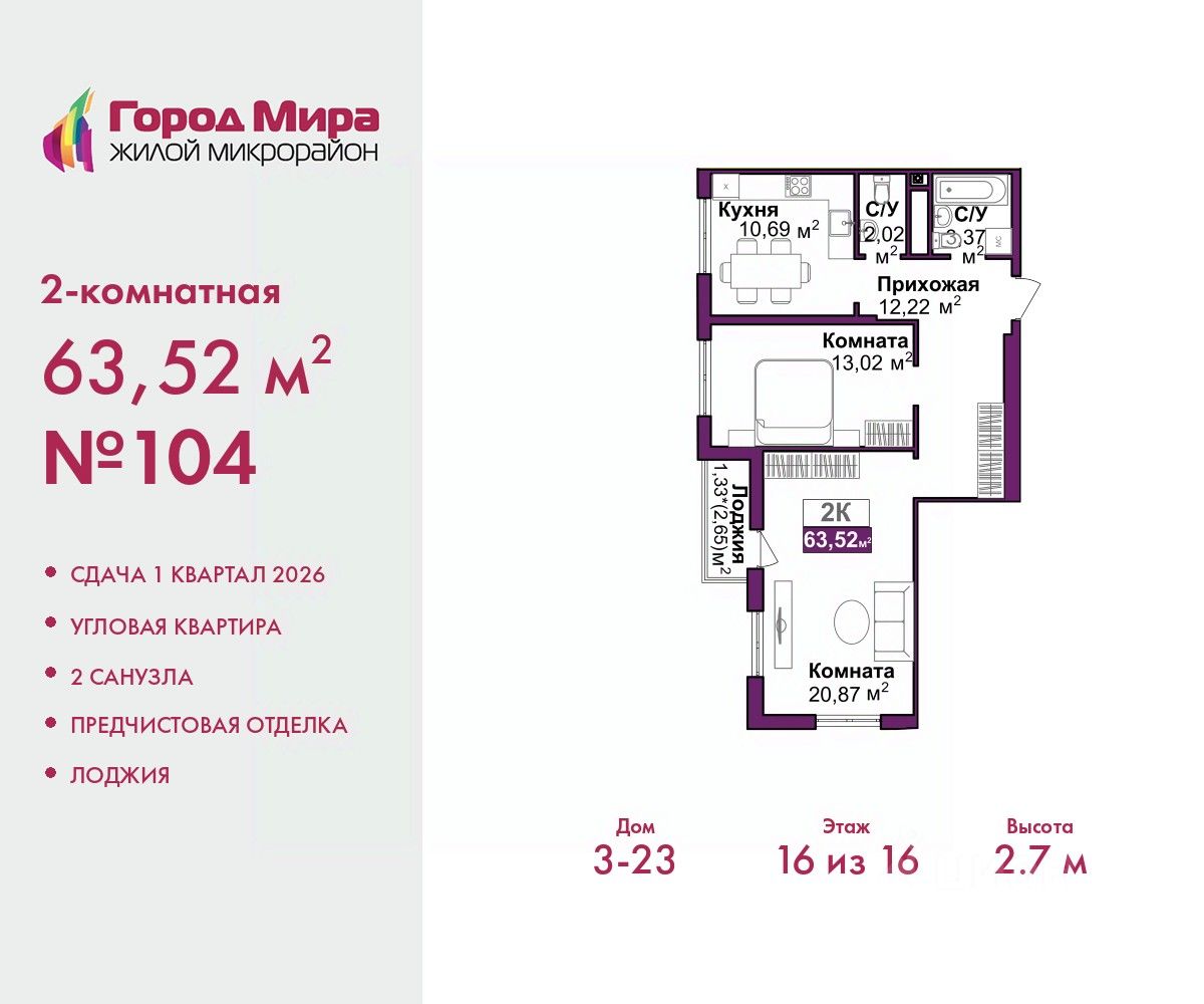 2-комн. квартира от застройщика с предчистовой отделкой в ЖМ ''Город Мира'' на 16 этаже. Общая площадь: 63.52 кв.м., жилая: 33.89 кв.м., площадь просторной кухни-столовой: 10.69 кв.м. Угловая квартира, очень светлая, естественная вентиляция при открытии окон. В квартире одна лоджия, один совмещенный и один раздельный санузел. Высота потолков 2.7 м. Жилой комплекс ''Город Мира'' комфорт и гармония в современном формате. ''Город Мира'' это масштабный жилой комплекс, созданный для тех, кто ценит комфорт, безопасность и гармонию с природой. Здесь продумана каждая деталь от удобной инфраструктуры до эргономичных планировок квартир. В 2024 году микрорайон ''Город Мира'' победил в номинации ''Лучший экологический проект года в сфере строительства'' по версии премии Crimea Urban Awards. Ключевые преимущества комплекса: - удачное расположение зеленый район с благоприятным микроклиматом - продуманное зонирование жилые кварталы, зоны отдыха и коммерческие объекты - комфорт-класс высокое качество строительства и современные инженерные решения Инфраструктура ''Города Мира'': Образование и досуг: - 2 детских сада (по 260 мест каждый) - планируется строительство общеобразовательной школы - детские и спортивные площадки в каждом дворе - беседки для отдыха, зоны для выгула собак Ритейл и сервис: - магазины, аптеки, медицинские центры - фитнес-клубы, салоны красоты - детские развивающие центры Парковки: - гостевые парковки - наземные и подземные паркинги Квартиры с продуманным комфортом: - просторные планировки с кладовыми и колясочными - лоджии с остеклением - автономное отопление (по 23 дому: индивидуальное отопление) - выполнена стяжка пола (по 3, 4, 20, 21, 22 домам: выполненная стяжка пола и штукатурка стен) - Консьерж-сервис для дополнительного удобства Благоустройство территории: - ландшафтный дизайн с зонами отдыха - современные детские площадки - стильные холлы с дизайнерской отделкой - система видеонаблюдения для безопасности ''Город Мира'' это место, где созданы все условия для комфортной жизни. Выбирайте качество и продуманность в каждой детали! Квартира находится в корпусе 3_23. Дом монолитный, одноподъездный, высотой 16 этажей. В подъезде 1 пассажирский и 1 грузовой лифт. Окончание строительства - 1 квартал 2026 года. Оформление сделки по договору долевого участия. #ZmMU1Z