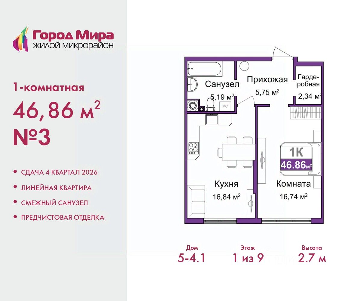 Однокомнатная квартира от застройщика с предчистовой отделкой в ЖМ ''Город Мира'' на 1 этаже. Общая площадь: 46.86 кв.м., жилая: 16.74 кв.м., площадь просторной кухни-столовой: 16.84 кв.м. Все окна выходят на одну сторону. В квартире один совмещенный санузел. Высота потолков 2.7 м. Квартиры в ЖК ''Город Мира'' ваш комфорт начинается здесь! ''Город Мира'' это масштабный жилой комплекс, созданный для тех, кто ценит комфорт, безопасность и гармонию с природой. Здесь продумана каждая деталь: от удобной инфраструктуры до эргономичных планировок квартир. В 2024 году микрорайон ''Город Мира'' победил в номинации ''Лучший экологический проект года в сфере строительства'' по версии премии Crimea Urban Awards. Почему выбирают наш комплекс: - Зеленый оазис живите среди природы в черте города. - Всё под рукой 2 детских сада, магазины, фитнес, медицина. - Безопасность: закрытая территория с видеонаблюдением. Наши квартиры: - Просторные планировки с кладовыми. - Лоджии с остеклением. - Автономное отопление: платите только за реальное потребление. - Предчистовая отделка, включает стяжку пола, без штукатурки стен. - Консьерж-сервис и подземный паркинг. Инфраструктура комплекса: - Детские и спортивные площадки. - Зоны отдыха с беседками. - Фитнес-клубы и салоны красоты. - Будущая школа на территории, уже функционируют два детских сада. Выгодные условия покупки: - Ипотека от 5,5%, военная ипотека от 5,5%. - Рассрочка. - Материнский капитал на первоначальный взнос. Квартира находится в корпусе 5_4.1. Дом монолитный, одноподъездный, высотой 9 этажей. В подъезде 1 грузовой лифт. Окончание строительства - 4 квартал 2026 года. Оформление сделки по договору долевого участия. #Z6AlOC