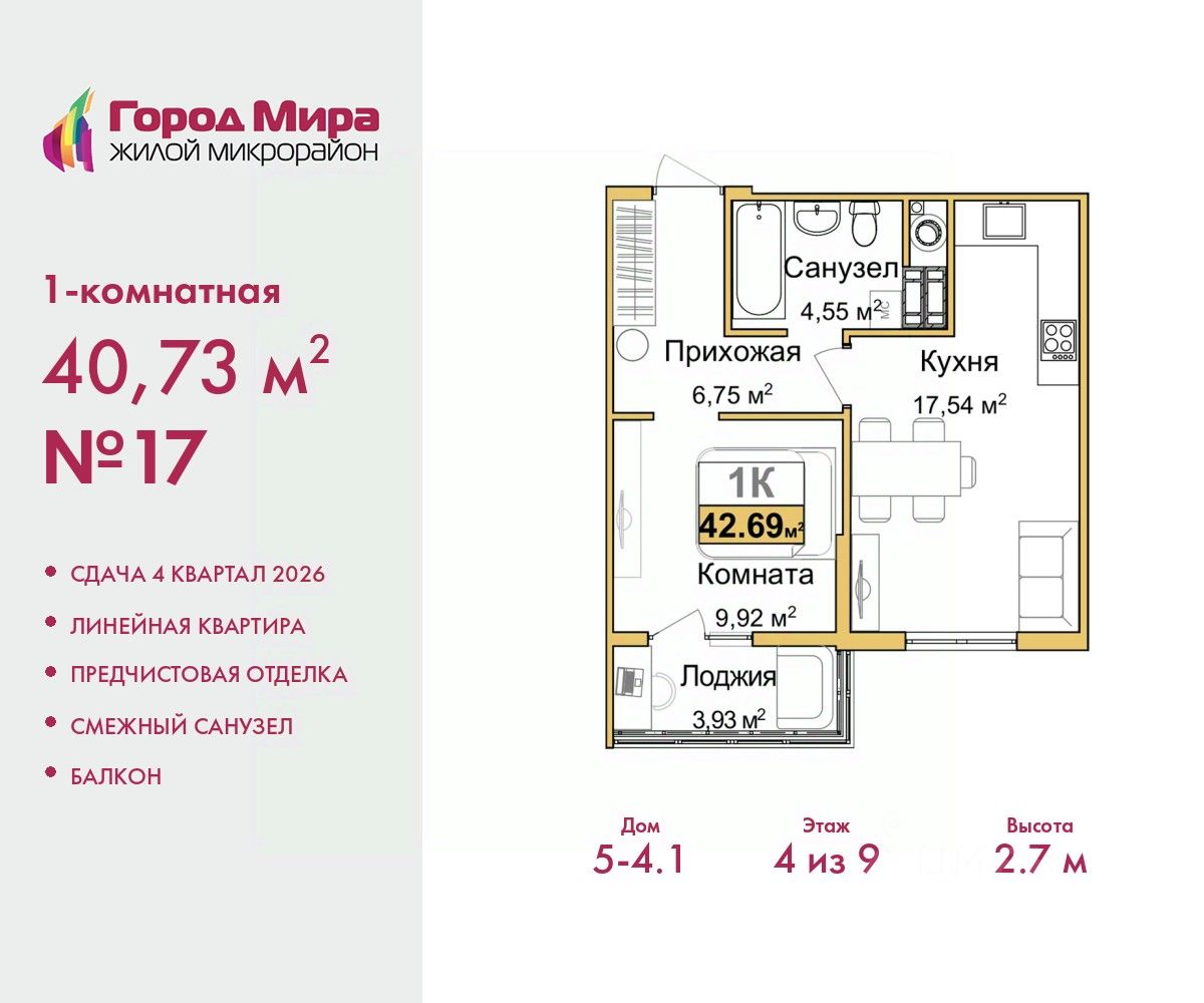 1-комн. квартира с предчистовой отделкой в ЖМ ''Город Мира'' на 4 этаже. Общая площадь: 40.73 кв.м., жилая: 9.92 кв.м., площадь просторной кухни-столовой: 17.54 кв.м. Все окна выходят на одну сторону. В квартире один балкон, один совмещенный санузел. Высота потолков 2.7 м. Квартиры в ЖК ''Город Мира'' ваш комфорт начинается здесь! ''Город Мира'' это масштабный жилой комплекс, созданный для тех, кто ценит комфорт, безопасность и гармонию с природой. Здесь продумана каждая деталь: от удобной инфраструктуры до эргономичных планировок квартир. В 2024 году микрорайон ''Город Мира'' победил в номинации ''Лучший экологический проект года в сфере строительства'' по версии премии Crimea Urban Awards. Почему выбирают наш комплекс: - Зеленый оазис живите среди природы в черте города. - Всё под рукой 2 детских сада, магазины, фитнес, медицина. - Безопасность: закрытая территория с видеонаблюдением. Наши квартиры: - Просторные планировки с кладовыми. - Лоджии с остеклением. - Автономное отопление: платите только за реальное потребление. - Предчистовая отделка, включает стяжку пола, без штукатурки стен. - Консьерж-сервис и подземный паркинг. Инфраструктура комплекса: - Детские и спортивные площадки. - Зоны отдыха с беседками. - Фитнес-клубы и салоны красоты. - Будущая школа на территории, уже функционируют два детских сада. Выгодные условия покупки: - Ипотека от 5,5%, военная ипотека от 5,5%. - Рассрочка. - Материнский капитал на первоначальный взнос. Квартира находится в корпусе 5_4.1. Дом монолитный, одноподъездный, высотой 9 этажей. В подъезде 1 грузовой лифт. Окончание строительства - 4 квартал 2026 года. Оформление сделки по договору долевого участия. #Z6alod