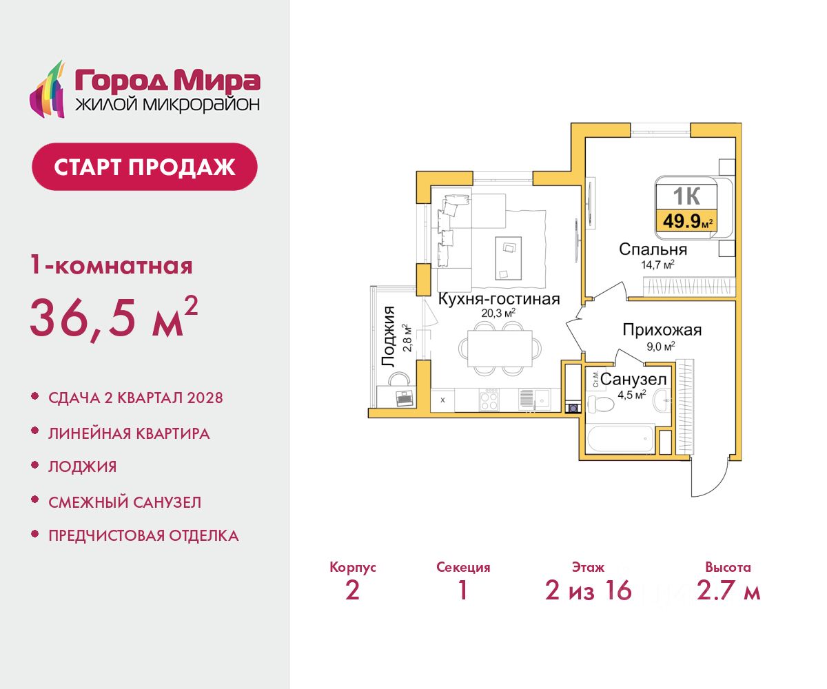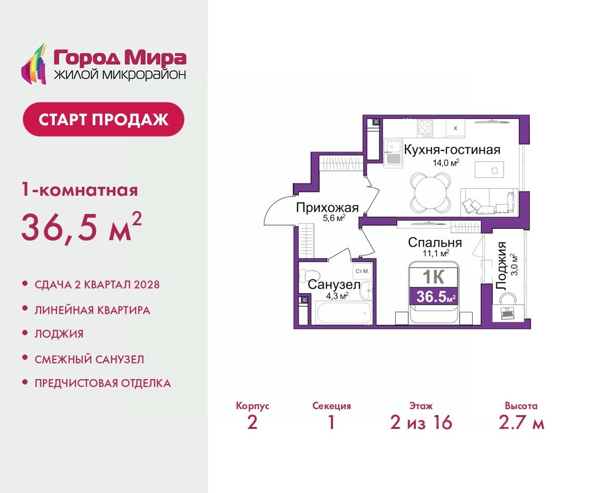Однокомнатная квартира от застройщика с предчистовой отделкой в ЖМ ''Город Мира'' на 4 этаже. Общая площадь: 36.5 кв.м., жилая: 11.1 кв.м., площадь просторной кухни-столовой: 14 кв.м. Все окна выходят на одну сторону. В квартире одна лоджия, один совмещенный санузел. Высота потолков 2.7 м. ''Город Мира'' это масштабный жилой комплекс, созданный для тех, кто ценит комфорт, безопасность и гармонию с природой. Здесь продумана каждая деталь от удобной инфраструктуры до эргономичных планировок квартир. ''Город Мира'' победил в номинации ''Лучший экологический проект года в сфере строительства'' по версии премии Сrimеа Urbаn Аwаrds. Способы приобретения недвижимости в ''Городе Мира'': 1. Ипотека: семейная от 5,5%, военная, IT-ипотека, базовая ипотечная программа и комбо-ипотека. Одобрение заявки проходит сразу в отделе продаж. 2. Материнский капитал на первый взнос. 3. Рассрочка от застройщика - до июня 2028 года! Первоначальный взнос от 30%. 4. Военная ипотека. Участники НИС могут приобрести квартиры по спец.цене. Ключевые преимущества комплекса: удачное расположение зеленый район с благоприятным микроклиматом продуманное зонирование жилые кварталы, зоны отдыха и коммерческие объекты комфорт-класс высокое качество строительства и современные инженерные решения Почему дом повышенной комфортности 2 в ''Городе Мира'' это лучшее решение? Образование и досуг: 2 детских сада (по 260 мест каждый) планируется строительство общеобразовательной школы детские и спортивные площадки в каждом дворе беседки для отдыха, зоны для выгула собак Ритейл и сервис: магазины, аптеки, медицинские центры фитнес-клубы, салоны красоты детские развивающие центры Парковки: гостевые парковки наземные и подземные паркинги Квартиры с продуманным комфортом: просторные планировки с кладовыми и колясочными лоджии с остеклением лапомойки для питомцев на первых этажах домов индивидуальное отопление выполнена стяжка пола и штукатурка стен консьерж-сервис для дополнительного удобства Благоустройство территории: ландшафтный дизайн с зонами отдыха современные детские площадки стильные холлы с дизайнерской отделкой система видеонаблюдения для безопасности ''Город Мира'' это место, где созданы все условия для комфортной жизни. Выбирайте качество и продуманность в каждой детали! Квартира находится во доме повышенной комфортности 2, 4-я очередь. Дом монолитно-каркасный, одноподъездный, высотой 16 этажей. В подъезде 1 пассажирский и 1 грузовой лифт. Окончание строительства - 2 квартал 2028 года. Оформление сделки по договору долевого участия. Квартира находится в корпусе 2. Дом монолитный, одноподъездный, высотой 16 этажей. На этаже 7 квартир. В подъезде 1 пассажирский и 1 грузовой лифт. Окончание строительства - 2 квартал 2028 года. Оформление сделки по договору долевого участия. #zmE2gI