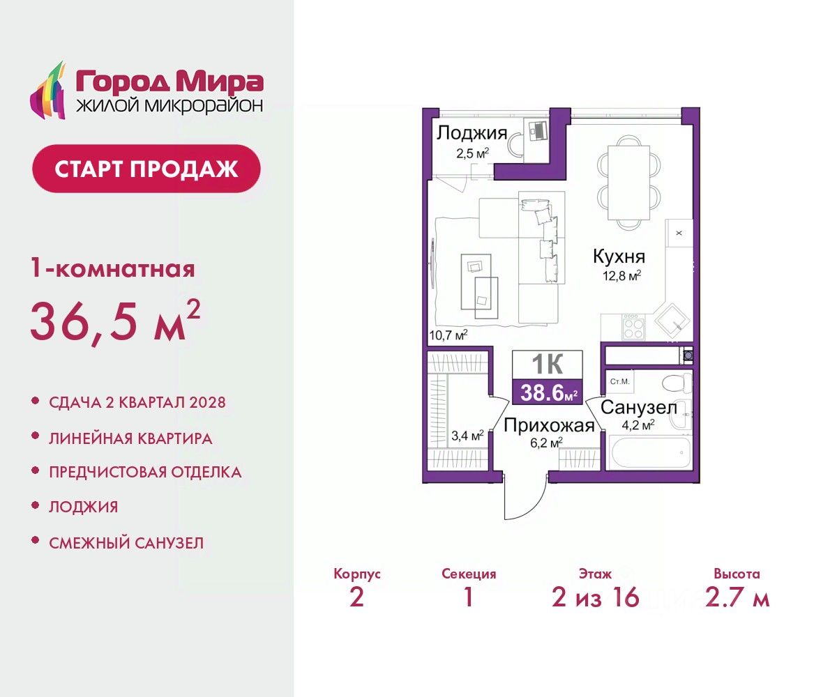 Продается однокомнатная квартира с предчистовой отделкой в ЖМ ''Город Мира'' на 12 этаже. Общая площадь: 38.6 кв.м., жилая: 10.7 кв.м., площадь просторной кухни-столовой: 12.8 кв.м. Все окна выходят на одну сторону. В квартире одна лоджия, один совмещенный санузел. Высота потолков 2.7 м. ''Город Мира'' это масштабный жилой комплекс, созданный для тех, кто ценит комфорт, безопасность и гармонию с природой. Здесь продумана каждая деталь от удобной инфраструктуры до эргономичных планировок квартир. ''Город Мира'' победил в номинации ''Лучший экологический проект года в сфере строительства'' по версии премии Сrimеа Urbаn Аwаrds. Способы приобретения недвижимости в ''Городе Мира'': 1. Ипотека: семейная от 5,5%, военная, IT-ипотека, базовая ипотечная программа и комбо-ипотека. Одобрение заявки проходит сразу в отделе продаж. 2. Материнский капитал на первый взнос. 3. Рассрочка от застройщика - до июня 2028 года! Первоначальный взнос от 30%. 4. Военная ипотека. Участники НИС могут приобрести квартиры по спец.цене. Ключевые преимущества комплекса: удачное расположение зеленый район с благоприятным микроклиматом продуманное зонирование жилые кварталы, зоны отдыха и коммерческие объекты комфорт-класс высокое качество строительства и современные инженерные решения Почему дом повышенной комфортности 2 в ''Городе Мира'' это лучшее решение? Образование и досуг: 2 детских сада (по 260 мест каждый) планируется строительство общеобразовательной школы детские и спортивные площадки в каждом дворе беседки для отдыха, зоны для выгула собак Ритейл и сервис: магазины, аптеки, медицинские центры фитнес-клубы, салоны красоты детские развивающие центры Парковки: гостевые парковки наземные и подземные паркинги Квартиры с продуманным комфортом: просторные планировки с кладовыми и колясочными лоджии с остеклением лапомойки для питомцев на первых этажах домов индивидуальное отопление выполнена стяжка пола и штукатурка стен консьерж-сервис для дополнительного удобства Благоустройство территории: ландшафтный дизайн с зонами отдыха современные детские площадки стильные холлы с дизайнерской отделкой система видеонаблюдения для безопасности ''Город Мира'' это место, где созданы все условия для комфортной жизни. Выбирайте качество и продуманность в каждой детали! Квартира находится во доме повышенной комфортности 2, 4-я очередь. Дом монолитно-каркасный, одноподъездный, высотой 16 этажей. В подъезде 1 пассажирский и 1 грузовой лифт. Окончание строительства - 2 квартал 2028 года. Оформление сделки по договору долевого участия. Квартира находится в корпусе 2. Дом монолитный, одноподъездный, высотой 16 этажей. На этаже 7 квартир. В подъезде 1 пассажирский и 1 грузовой лифт. Окончание строительства - 2 квартал 2028 года. Оформление сделки по договору долевого участия. #z6eZg2