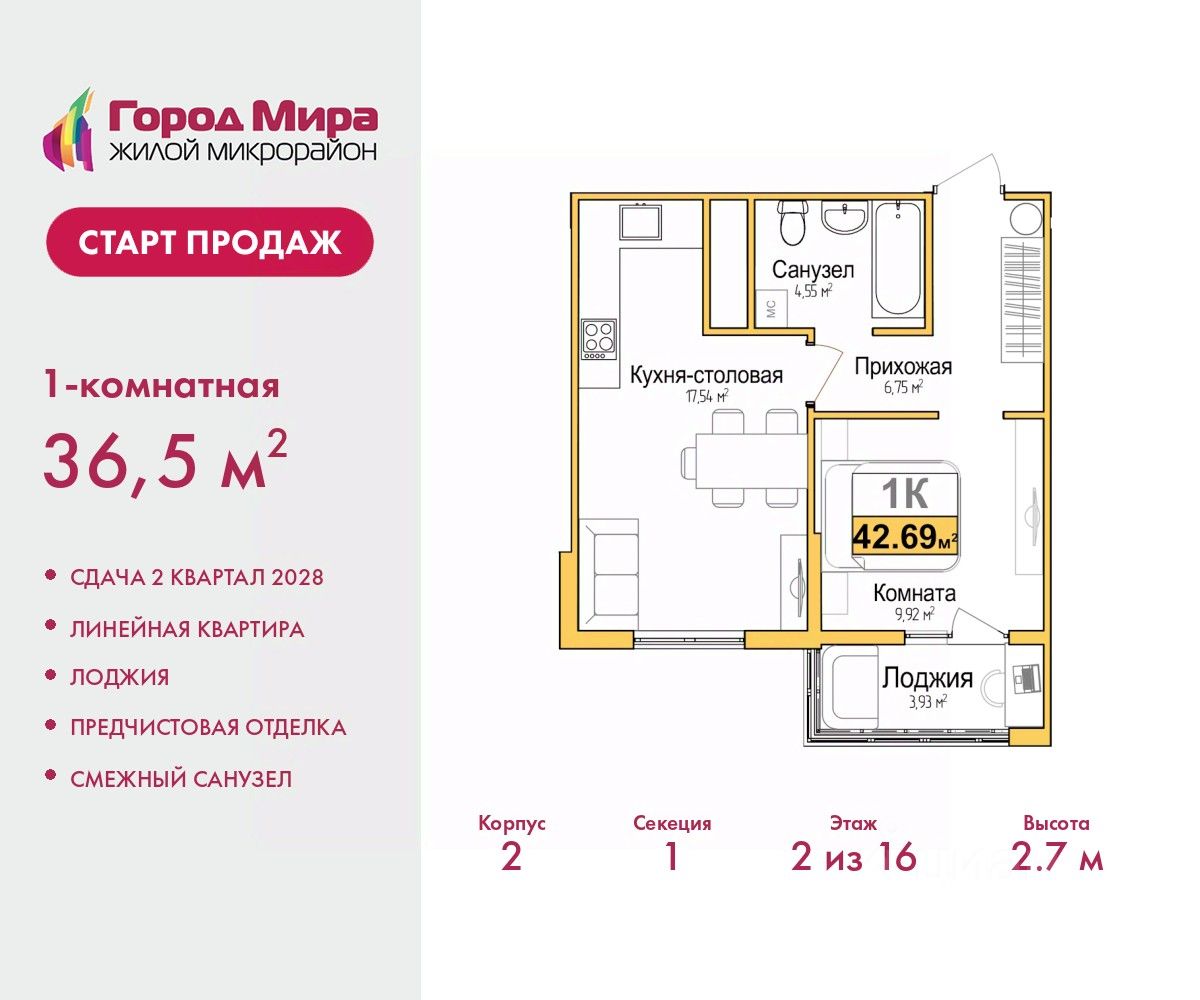 Просторная 2-комн. квартира с европланировкой и предчистовой отделкой в ЖМ ''Город Мира'' на 2 этаже. Общая площадь: 42.69 кв.м., жилая: 17.46 кв.м., суммарная площадь гостиной-столовой с кухонной зоной: 17.54 кв.м. Европланировка, за счет большой площади кухни-гостиной квартира выглядит просторной и очень удобна для жизни. Комнаты изолированные, все окна выходят на одну сторону. В квартире один балкон, один совмещенный санузел. Высота потолков 2.7 м. ''Город Мира'' это масштабный жилой комплекс, созданный для тех, кто ценит комфорт, безопасность и гармонию с природой. Здесь продумана каждая деталь от удобной инфраструктуры до эргономичных планировок квартир. ''Город Мира'' победил в номинации ''Лучший экологический проект года в сфере строительства'' по версии премии Сrimеа Urbаn Аwаrds. Способы приобретения недвижимости в ''Городе Мира'': 1. Ипотека: семейная от 5,5%, военная, IT-ипотека, базовая ипотечная программа и комбо-ипотека. Одобрение заявки проходит сразу в отделе продаж. 2. Материнский капитал на первый взнос. 3. Рассрочка от застройщика - до июня 2028 года! Первоначальный взнос от 30%. 4. Военная ипотека. Участники НИС могут приобрести квартиры по спец.цене. Ключевые преимущества комплекса: удачное расположение зеленый район с благоприятным микроклиматом продуманное зонирование жилые кварталы, зоны отдыха и коммерческие объекты комфорт-класс высокое качество строительства и современные инженерные решения Почему дом повышенной комфортности 2 в ''Городе Мира'' это лучшее решение? Образование и досуг: 2 детских сада (по 260 мест каждый) планируется строительство общеобразовательной школы детские и спортивные площадки в каждом дворе беседки для отдыха, зоны для выгула собак Ритейл и сервис: магазины, аптеки, медицинские центры фитнес-клубы, салоны красоты детские развивающие центры Парковки: гостевые парковки наземные и подземные паркинги Квартиры с продуманным комфортом: просторные планировки с кладовыми и колясочными лоджии с остеклением лапомойки для питомцев на первых этажах домов индивидуальное отопление выполнена стяжка пола и штукатурка стен консьерж-сервис для дополнительного удобства Благоустройство территории: ландшафтный дизайн с зонами отдыха современные детские площадки стильные холлы с дизайнерской отделкой система видеонаблюдения для безопасности ''Город Мира'' это место, где созданы все условия для комфортной жизни. Выбирайте качество и продуманность в каждой детали! Квартира находится во доме повышенной комфортности 2, 4-я очередь. Дом монолитно-каркасный, одноподъездный, высотой 16 этажей. В подъезде 1 пассажирский и 1 грузовой лифт. Окончание строительства - 2 квартал 2028 года. Оформление сделки по договору долевого участия. Квартира находится в корпусе 2. Дом монолитный, одноподъездный, высотой 16 этажей. На этаже 7 квартир. В подъезде 1 пассажирский и 1 грузовой лифт. Окончание строительства - 2 квартал 2028 года. Оформление сделки по договору долевого участия. #Z