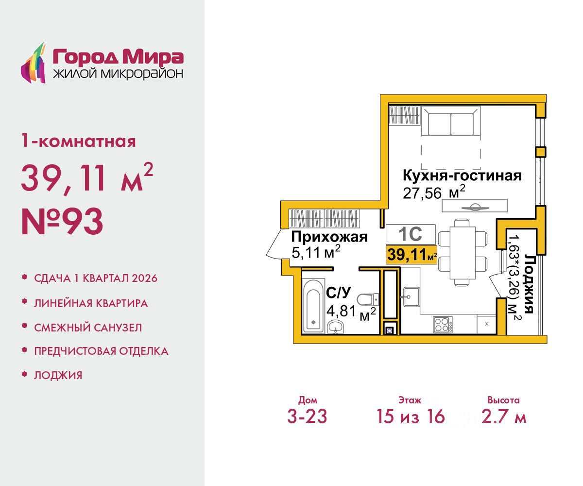 39 м² · Этаж 15 из 16