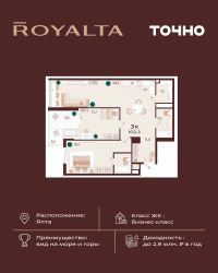 ЖК ''Sky Plaza 5.0'' - это пятая очередь премиального комплекса апартаментов, расположенного на живописном побережье Черного моря. Этот уникальный проект сочетает в себе современные технологии строительства, изысканный дизайн и безупречный комфорт.Здание представляет собой монолитный блок с волнообразным фасадом, который гармонично вписывается в морской пейзаж, создавая ощущение легкости и элегантности.Комплекс состоит из 8 этажей, два из которых отведены под подземные паркинги, а 6 этажей - под роскошные апартаменты площадью от 39 до 192 кв. метров.Ваш новый дом у моря ждет вас! Подарите себе и своим близким возможность жить в окружении красоты, комфорта и роскоши.Панорамное остекление и открытые широкие балконы-террасы с прозрачными стеклянными ограждениями дарят потрясающие виды на море и окружающие пейзажи.Рядом с комплексом находится знаменитый Массандровский парк - настоящий шедевр садово-паркового искусства, где можно насладиться прогулками среди вековых деревьев и живописных аллей.Всего в 15 минутах пешком вас ждет Ялтинская набережная - сердце города, где каждый вечер можно ощутить неповторимую атмосферу крымского променада. А любители морского отдыха оценят близость пляжа.Всего в 80 метрах от дома вас ждет собственный пляж Sky Beach, оборудованный всей необходимой инфраструктурой: бассейны, уютные кафе, рестораны с видом на море и многое другое.В шаговой доступности расположены магазины, аптека, современный тренажерный зал и аквапарк, что делает жизнь здесь максимально удобной и насыщенной.Для владельцев автомобилей предусмотрена двухуровневая подземная парковка. Теперь маршрут от парковочного места до квартиры существенно сокращен, и быстрый спуск на лифте к личному транспортному средству займет не более 5 минут.Для вашего комфорта здесь предусмотрена централизованная система вентиляции и кондиционирования, а также собственная мини-котельная, обеспечивающая тепло и уют в любое время года.Высота потолков в 3 метра создает ощущение простора и свободы.ЖК ''Sky Plaza 5.0'' - это не просто жилье, это стиль жизни, где каждая деталь создана для вашего удовольствия!