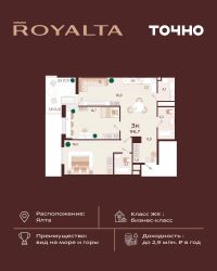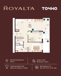 Продается видовой апартамент в самом современном и ярком комплексе Зазеркалье в самом престижном районе Ялты Приморский парк.Район Приморский парк бесспорно лучший.Ведь здесь есть все, что нужно для комфортной жизни и беззаботного отдыха благоустроенные пляжи, парк, главный променад Ялты центральная Набережная, многочисленные кофейни, кафе, рестораны и магазины, несколько СПА-комплексов, теннисные корты и фитнес-клуб все в пешей доступности.Зазеркалье это самый яркий комплекс апартаментов Крыма в самом престижном районе Ялты Приморский парк.Это сочетание неповторимых природных красот, свежего воздуха и современной архитектуры.Изысканность современных дизайнерских решений, уникальные ландшафтные и климатические условия, дополнительный сервис гарантируют наслаждение беззаботной жизнью у моря с максимальным комфортом.Апартамент расположен на высоком 17 этаже откуда открывается красивейший вид на море, парк и горы.Особое достоинство апартамента большая терраса.Отличное место, где можно:+ взбодриться чашечкой кофе и позавтракать утром+ позагорать на шезлонгах под южным ласковым солнцем+ насладиться бокалом Крымского вина вечеромСвободная планировка.Площадь и количество окон позволяют распланировать 1-2 спальни, гостиную с кухней-столовой, 1-2 санузла.Оконные системы Reynaers Aluminium с энергосберегающими стеклопакетамиИнфраструктура комплекса Зазеркалье позволит вам максимально эффективно использовать свободное время:+ Лобби-бар и консьерж-сервис+ Ресторан авторской кухни The Mad Cook+ СПА-центр с бассейном и соляной комнатой+ Панорамный бассейн-инфинити и баня на крыше+ Центр эстетической медицины и косметологии ZZ Clinic,+ Тренажерный зал+ Детская комната с аниматором и детская игровая площадка+ Подземный 4-уровневый паркинг на 120 автомобилей+ Современная система безопасности охрана 24/7, видеонаблюдение, пожарная безопасность+ Специальный тариф на посещение аквапарка Атлантида в 7 минутах ходьбы.Этот апартамент на первой линии у моря одно из лучших предложений на Южном берегу Крыма подарит тепло, комфорт и безопасность новым владельцам и их гостям!Звоните! Я отвечу на ваши вопросы, а также организую просмотр апартамента в удобное для Вас время.