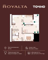 Продаётся 3-комнатная квартира в строящемся доме (Корпус 1), срок сдачи: II-кв. 2027, общей площадью 75.9 кв.м., на 3 этаже. Жилой комплекс бизнес-класса ''РОЯЛТА'' от застройщика ''ГК ТОЧНО'' в городе Ялта Республики Крым на улице Спендиарова.