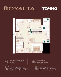 Жилой комплекс ''РОЯЛТА'' включает 5 монолитно-кирпичных девятиэтажных зданий. Проект предлагает квартиры различных планировок: от однокомнатных до трехкомнатных с расширенными балконами и террасами до 13,4 м2. Территория будет благоустроена детскими игровыми и спортивными площадками, гостевой автостоянкой и озеленением, включая газоны, деревья и кустарники. Также появятся современные уличные тренажёры, СПА-комплекс и панорамный инфинити-бассейн. В шаговой доступности находятся центральная набережная Ялты, детские сады, школы, супермаркеты, торговые центры, Ялтинский медицинский колледж, автовокзал и Мордвиновский парк.