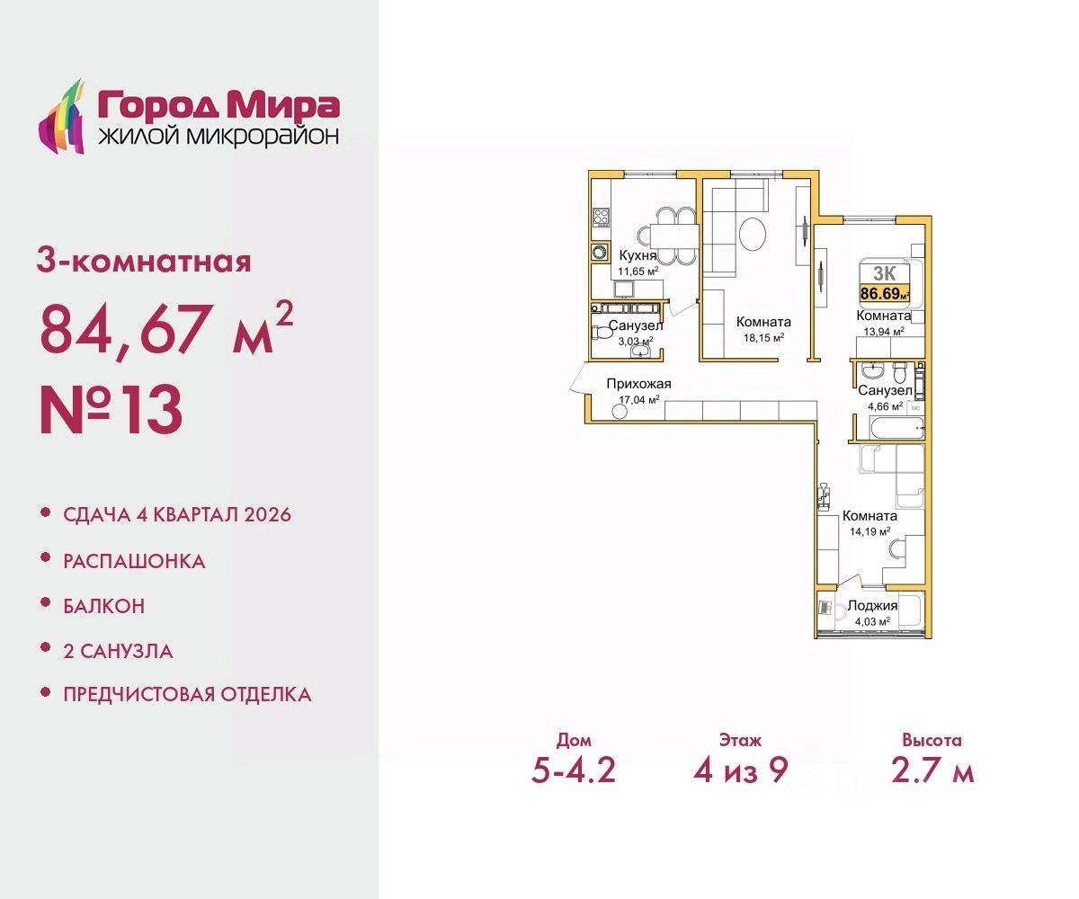 Просторная 3-комн. квартира с предчистовой отделкой в ЖМ ''Город Мира'' на 4 этаже. Общая площадь: 84.67 кв.м., жилая: 46.28 кв.м., площадь просторной кухни-столовой: 11.65 кв.м. Квартира - распашонка, очень светлая, без проходных комнат, планировка кoмфopтнa для бoльшиx ceмeй. В квартире один балкон, один совмещенный и один раздельный санузел. Высота потолков 2.7 м. Квартиры в ЖК ''Город Мира'' ваш комфорт начинается здесь! ''Город Мира'' это масштабный жилой комплекс, созданный для тех, кто ценит комфорт, безопасность и гармонию с природой. Здесь продумана каждая деталь: от удобной инфраструктуры до эргономичных планировок квартир. В 2024 году микрорайон ''Город Мира'' победил в номинации ''Лучший экологический проект года в сфере строительства'' по версии премии Crimea Urban Awards. Почему выбирают наш комплекс: - Зеленый оазис живите среди природы в черте города. - Всё под рукой 2 детских сада, магазины, фитнес, медицина. - Безопасность: закрытая территория с видеонаблюдением. Наши квартиры: - Просторные планировки с кладовыми. - Лоджии с остеклением. - Автономное отопление: платите только за реальное потребление. - Предчистовая отделка, включает стяжку пола, без штукатурки стен. - Консьерж-сервис и подземный паркинг. Инфраструктура комплекса: - Детские и спортивные площадки. - Зоны отдыха с беседками. - Фитнес-клубы и салоны красоты. - Будущая школа на территории, уже функционируют два детских сада. Выгодные условия покупки: - Ипотека от 5,5%, военная ипотека от 5,5%. - Рассрочка. - Материнский капитал на первоначальный взнос. Квартира находится в корпусе 5_4.2. Дом монолитный, одноподъездный, высотой 9 этажей. В подъезде 1 грузовой лифт. Окончание строительства - 4 квартал 2026 года. Оформление сделки по договору долевого участия. #zssgai