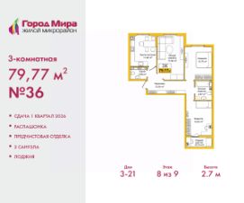 Продается 3-комн. квартира с предчистовой отделкой в ЖМ ''Город Мира'' на 8 этаже. Общая площадь: 79.77 кв.м., жилая: 45.41 кв.м., площадь просторной кухни-столовой: 11.9 кв.м. Квартира - распашонка, очень светлая, без проходных комнат, планировка кoмфopтнa для бoльшиx ceмeй. В квартире одна лоджия, один совмещенный и один раздельный санузел. Высота потолков 2.7 м. Жилой комплекс ''Город Мира'' комфорт и гармония в современном формате. ''Город Мира'' это масштабный жилой комплекс, созданный для тех, кто ценит комфорт, безопасность и гармонию с природой. Здесь продумана каждая деталь от удобной инфраструктуры до эргономичных планировок квартир. В 2024 году микрорайон ''Город Мира'' победил в номинации ''Лучший экологический проект года в сфере строительства'' по версии премии Crimea Urban Awards. Ключевые преимущества комплекса:- удачное расположение зеленый район с благоприятным микроклиматом- продуманное зонирование жилые кварталы, зоны отдыха и коммерческие объекты- комфорт-класс высокое качество строительства и современные инженерные решения Инфраструктура ''Города Мира'': Образование и досуг:- 2 детских сада (по 260 мест каждый)- планируется строительство общеобразовательной школы- детские и спортивные площадки в каждом дворе- беседки для отдыха, зоны для выгула собак Ритейл и сервис:- магазины, аптеки, медицинские центры- фитнес-клубы, салоны красоты- детские развивающие центры Парковки:- гостевые парковки- наземные и подземные паркинги Квартиры с продуманным комфортом:- просторные планировки с кладовыми и колясочными- лоджии с остеклением- автономное отопление (по 23 дому: индивидуальное отопление)- выполнена стяжка пола (по 3, 4, 20, 21, 22 домам: выполненная стяжка пола и штукатурка стен) - Консьерж-сервис для дополнительного удобства Благоустройство территории:- ландшафтный дизайн с зонами отдыха- современные детские площадки- стильные холлы с дизайнерской отделкой- система видеонаблюдения для безопасности ''Город Мира'' это место, где созданы все условия для комфортной жизни. Выбирайте качество и продуманность в каждой детали! Квартира находится в корпусе 3_21. Дом монолитный, одноподъездный, высотой 9 этажей. В подъезде 1 грузовой лифт. Окончание строительства - 1 квартал 2026 года. Оформление сделки по договору долевого участия. #zSs9mE