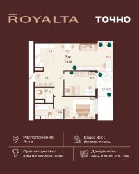 К продаже предлагается видовой эксклюзивный пентхаус 306,5 м² с завораживающими видами на море, скалы Адалары, гору Аю-Даг и горную гряду с виноградниками, расположенный в ЖК ''Ришелье Шато'' в Гурзуфе. Панорамная терраса является изюминкой этого пентхауса. Проект продуман до мелочей, выполнен под постоянным авторским надзором и соответствует самому изысканному запросу.Пентхаус находится последнем этаже 8-этажного дома, площадью 132,5 м², плюс открытая терраса 174 м² с панорамным видом на море, горы, старинный Гурзуф, знаменитую гору Аю-даг, а также на скалы Адалары.Планировка: прихожая, просторная гостиная совмещенная с кухней, выход на открытую террасу, 2 спальни с панорамными окнами и выходом на балкон, два санузла (один с ванной и панорамными окнами, второй с душевой), гардеробная, хоз. помещение.На террасе под перголой обустроена зона отдыха. Комфортная ротанговая мебель, выделена гриль зона, зимний сад, а также зона для загара. Есть возможность поставить джакузи.Выполнен дизайнерский ремонт в 2021г. В отделке использовали натуральные, высокотехнологичные и современные материалы: пол в прихожей и гостиной - керамогранит, пол в спальнях - кварц-винил, стены окрашены, потолки натяжные, ванна каменная ''Астро-аква''.Пентхаус полностью готов к проживанию. Вся мебель ручной работы изготовлена по индивидуальному проекту под заказ, в спальнях шторы оснащены электроприводом, со стороны террасы на панорамных окнах установлены рольставни, кровати с подъёмным механизмом, ортопедический матрас Grether&Wells, столешница на кухне искусственный камень.Техника ведущих мировых производителей: варочная поверхность, духовой шкаф, винный шкаф, холодильник и стиральная машина фирмы AEG, посудомоечная машина NEFF, умный чайник Xiaomi, в гостиной установлен кинотеатр с экраном 155 дюймов и профессиональным звуком, кондиционеры Mitsubishi. Отопление индивидуальное - двухконтурный газовый котел Baxi, полы с подогревом во всех помещениях (2 контура водяной и электрический), на случай отключения электроэнергии предусмотрен газовый генератор.О комплексе: Ришелье Шато это уникальный жилой комплекс, отвечающий всем представлениям о комфортнойжизни на берегу моря. Надежный и эргономичный проект, спроектированный лучшими крымскими архитекторами, представляет собой серию монолитно-каркасных домов с хорошей звукоизоляцией. Инфраструктура комплекса включает: -лаундж-зону с детским и взрослым бассейнами,-детскую площадку,-фитнес-центр,-магазины, кафе и рестораны,-охраняемый паркинг и территорию,-системы охранной и пожарной сигнализации.Современные системы жизнеобеспечения и безопасности: -сервисно-эксплуатационная служба, автономная газовая котельная,-собственный накопительный водный резервуар объёмом 1000 м,-собственная трансформаторная подстанция 1,5 МВт,-дизельная подстанция.До пляжа 800 метров до Ялты 20 минут на авто. Звоните! На связи 24/7.
