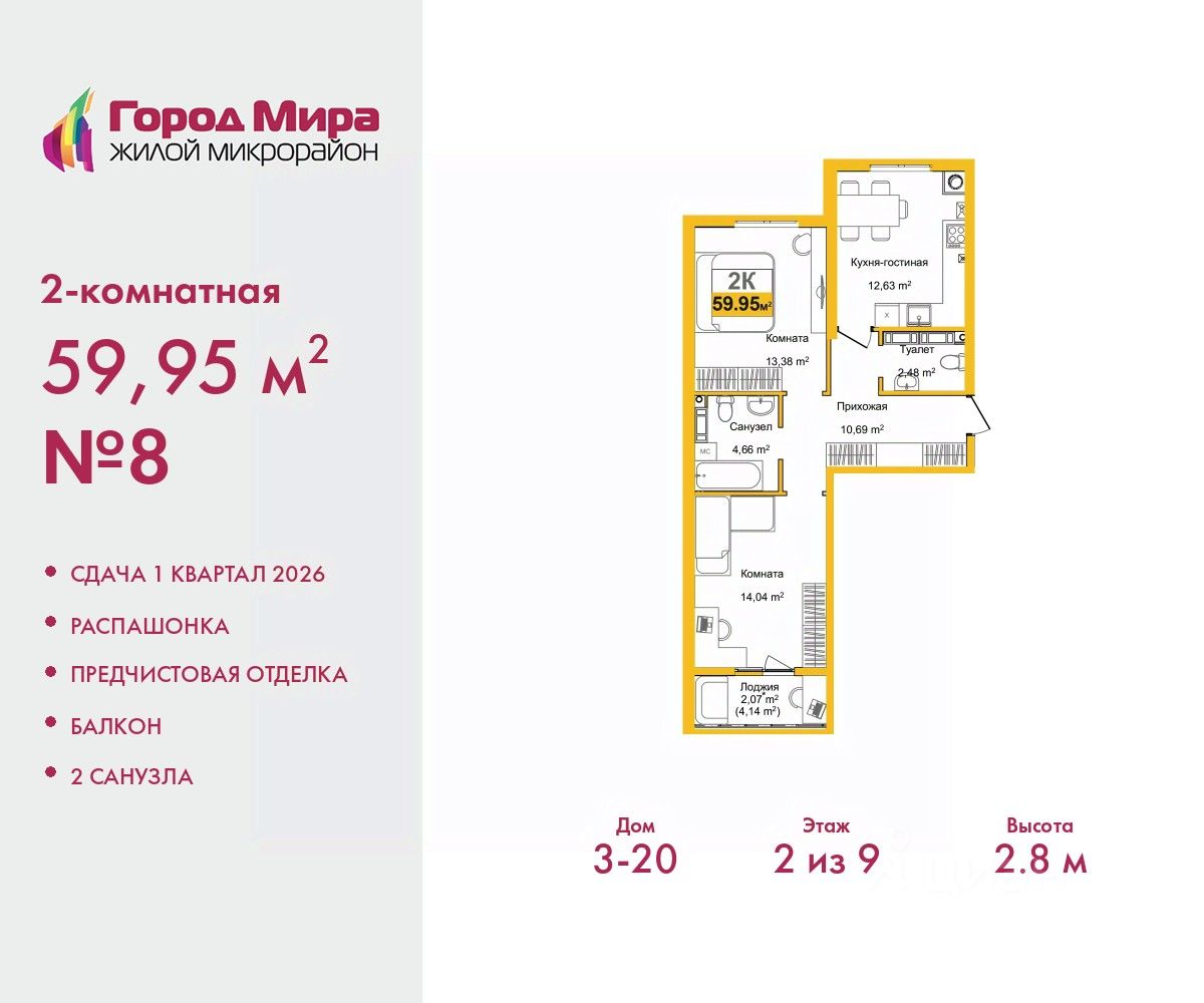 2-комн. квартира от застройщика с предчистовой отделкой в ЖМ ''Город Мира'' на 2 этаже. Общая площадь: 59.95 кв.м., жилая: 27.42 кв.м., площадь просторной кухни-столовой: 12.63 кв.м. Квартира - распашонка, без проходных комнат, окна выходят на paзные стороны дома. В квартире один балкон, один совмещенный и один раздельный санузел. Высота потолков 2.8 м. Жилой комплекс ''Город Мира'' комфорт и гармония в современном формате. ''Город Мира'' это масштабный жилой комплекс, созданный для тех, кто ценит комфорт, безопасность и гармонию с природой. Здесь продумана каждая деталь от удобной инфраструктуры до эргономичных планировок квартир. В 2024 году микрорайон ''Город Мира'' победил в номинации ''Лучший экологический проект года в сфере строительства'' по версии премии Crimea Urban Awards. Ключевые преимущества комплекса: - удачное расположение зеленый район с благоприятным микроклиматом - продуманное зонирование жилые кварталы, зоны отдыха и коммерческие объекты - комфорт-класс высокое качество строительства и современные инженерные решения Инфраструктура ''Города Мира'': Образование и досуг: - 2 детских сада (по 260 мест каждый) - планируется строительство общеобразовательной школы - детские и спортивные площадки в каждом дворе - беседки для отдыха, зоны для выгула собак Ритейл и сервис: - магазины, аптеки, медицинские центры - фитнес-клубы, салоны красоты - детские развивающие центры Парковки: - гостевые парковки - наземные и подземные паркинги Квартиры с продуманным комфортом: - просторные планировки с кладовыми и колясочными - лоджии с остеклением - автономное отопление (по 23 дому: индивидуальное отопление) - выполнена стяжка пола (по 3, 4, 20, 21, 22 домам: выполненная стяжка пола и штукатурка стен) - Консьерж-сервис для дополнительного удобства Благоустройство территории: - ландшафтный дизайн с зонами отдыха - современные детские площадки - стильные холлы с дизайнерской отделкой - система видеонаблюдения для безопасности ''Город Мира'' это место, где созданы все условия для комфортной жизни. Выбирайте качество и продуманность в каждой детали! Квартира находится в корпусе 3_20. Дом монолитный, одноподъездный, высотой 9 этажей. В подъезде 1 грузовой лифт. Окончание строительства - 1 квартал 2026 года. Оформление сделки по договору долевого участия. #Zm9CCV